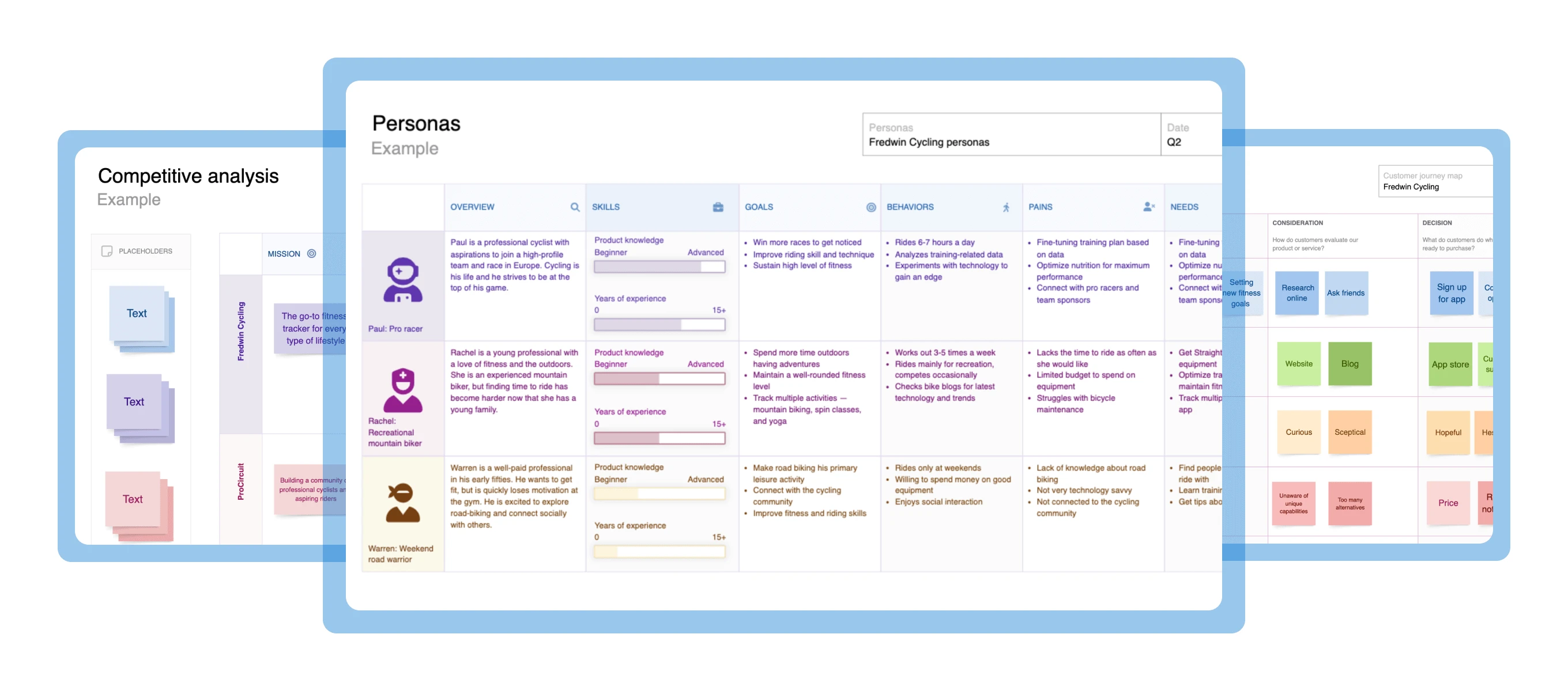 Keep track of what customers really want. Map out journey flows and analyze your place in the market. Dive in with research templates: