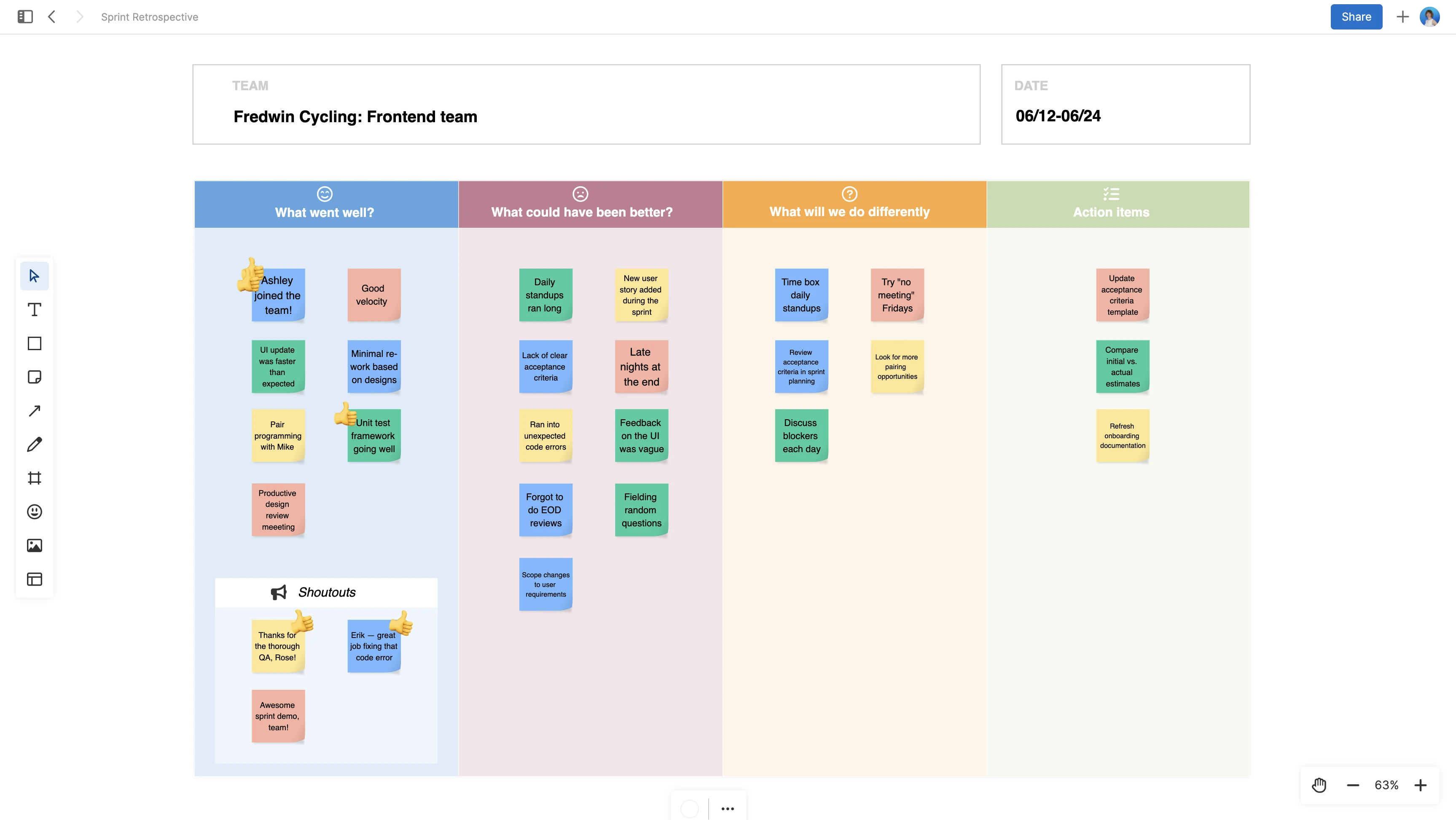 Meetings are meant to encourage reflection. Although the focus of the sprint retrospective template is for agile teams, it is useful no matter how you work. For any big effort, record what went well (or not) and why. As the ideas flow, group them into themes and add comments or emojis — to get a holistic view of the team's feedback.