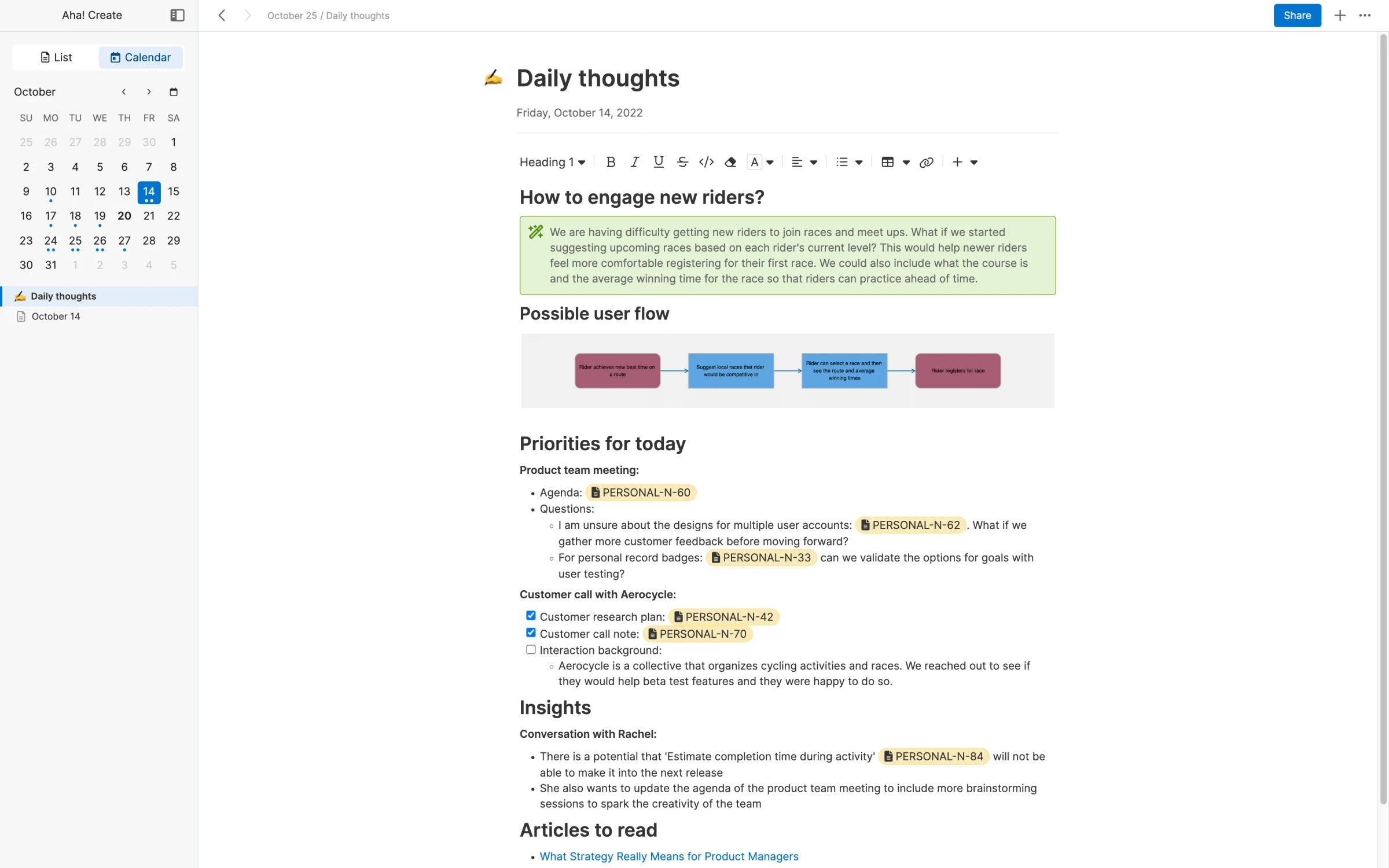 It is time to start your day. Open up a daily note. If you use Aha! Roadmaps, you can customize a note template to your liking, as shown below. Now, you can keep track of the day's priorities, insights, and any questions you need to ask the team. Think of these notes like a mental home base that you can come back to as the day goes on.