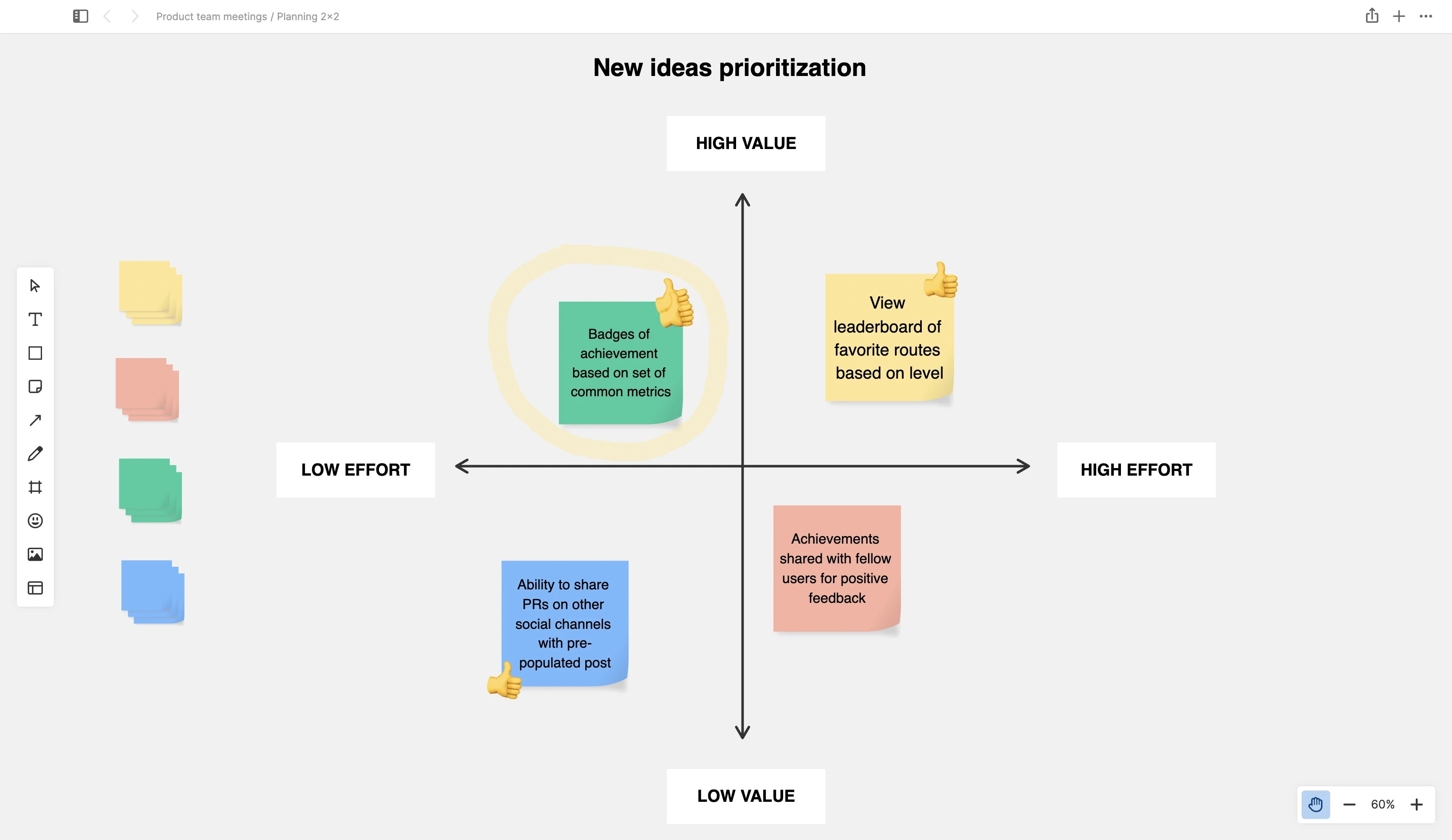As new ideas for your product arise, make quick decisions about what to prioritize. Use the 2x2 prioritization matrix to compare value and effort at a high level — before adding features to your backlog and assigning product value scores.