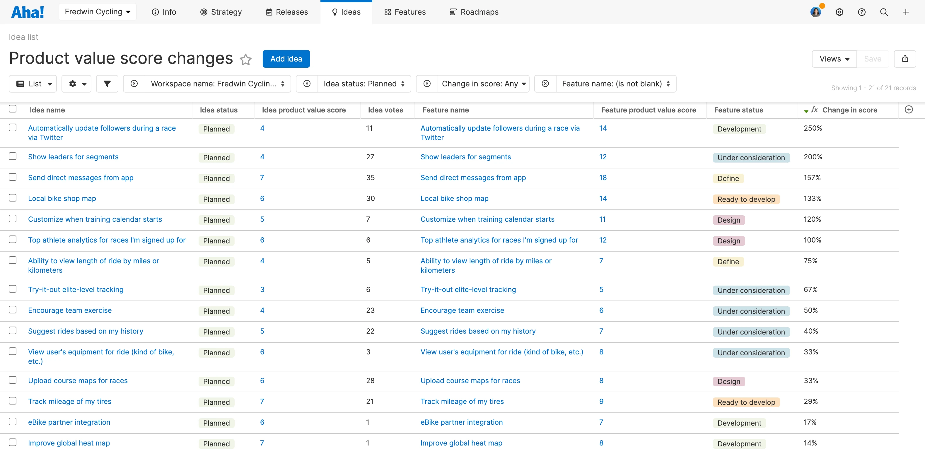 Aha! software gives you an understanding of your plans and progress at each stage of the process. There are more than 75 prebuilt product reports in Aha! Roadmaps, multiple ways to analyze feedback in Aha! Ideas, and a variety of reports in Aha! Develop to help agile teams monitor performance. Our own product development team references a variety of these views in our weekly meetings. These are lively discussions with many topics to cover. Having relevant references helps answer questions and keep us focused.