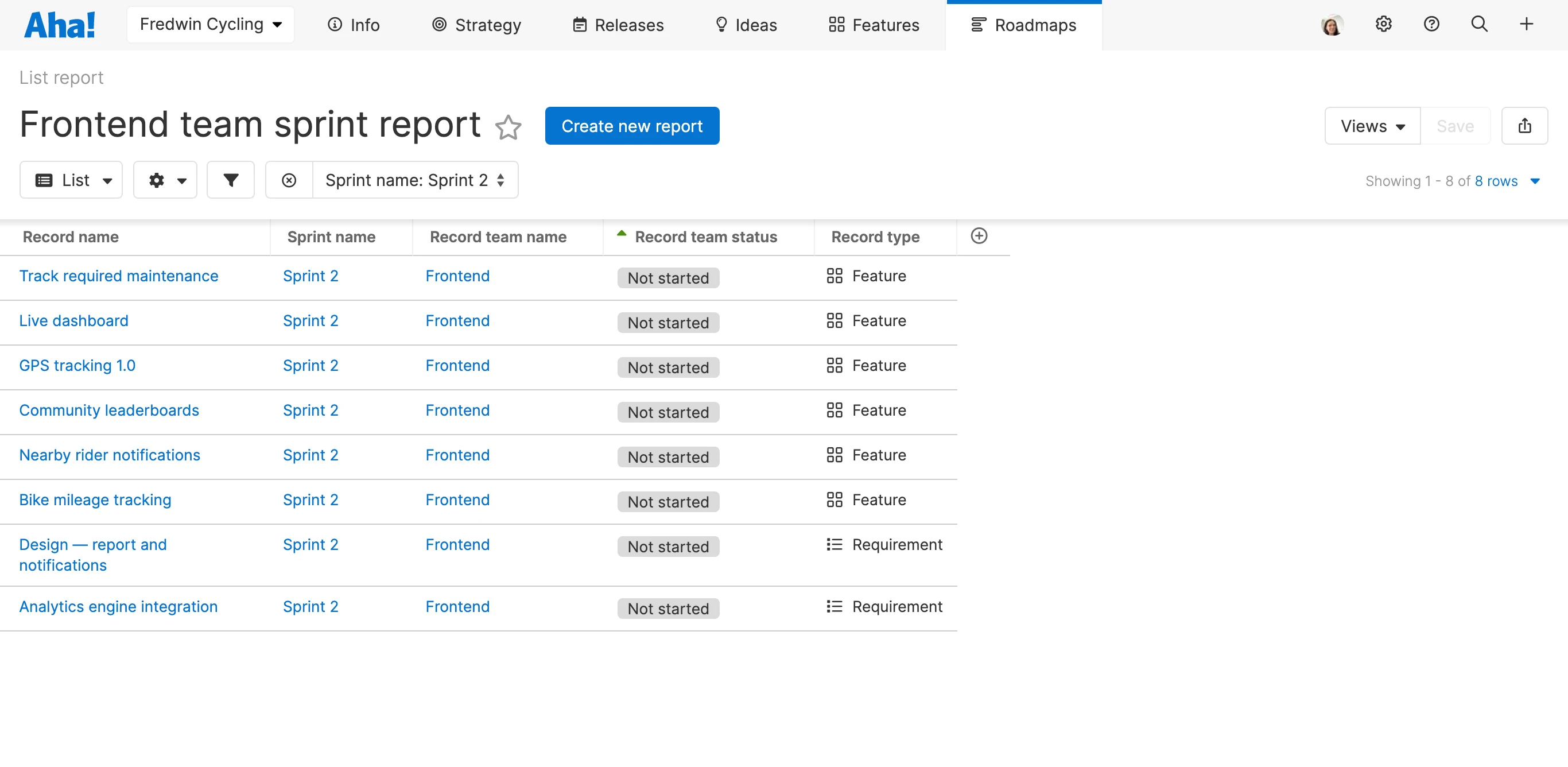 But sprints typically include a mix of work — so it makes sense that you would want to view multiple record types in a report. With today's update, you can now include mixed records from Aha! Roadmaps and Aha! Develop — then filter your data using any fields that are shared by the records. This functionality is an important step in creating a seamless product development environment and gaining the insights you need about engineering work that is happening now or coming soon.