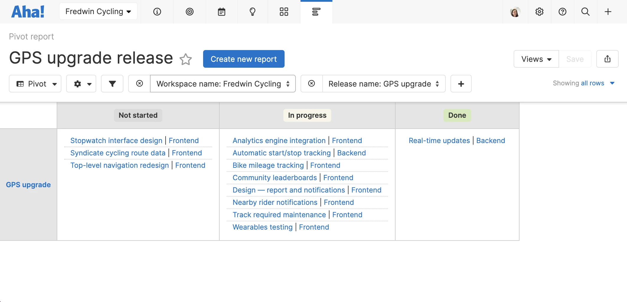 You can now build a single report in Aha! Roadmaps to view epics, features, and requirements from Aha! Develop — to better understand what engineering is working on and track their progress.