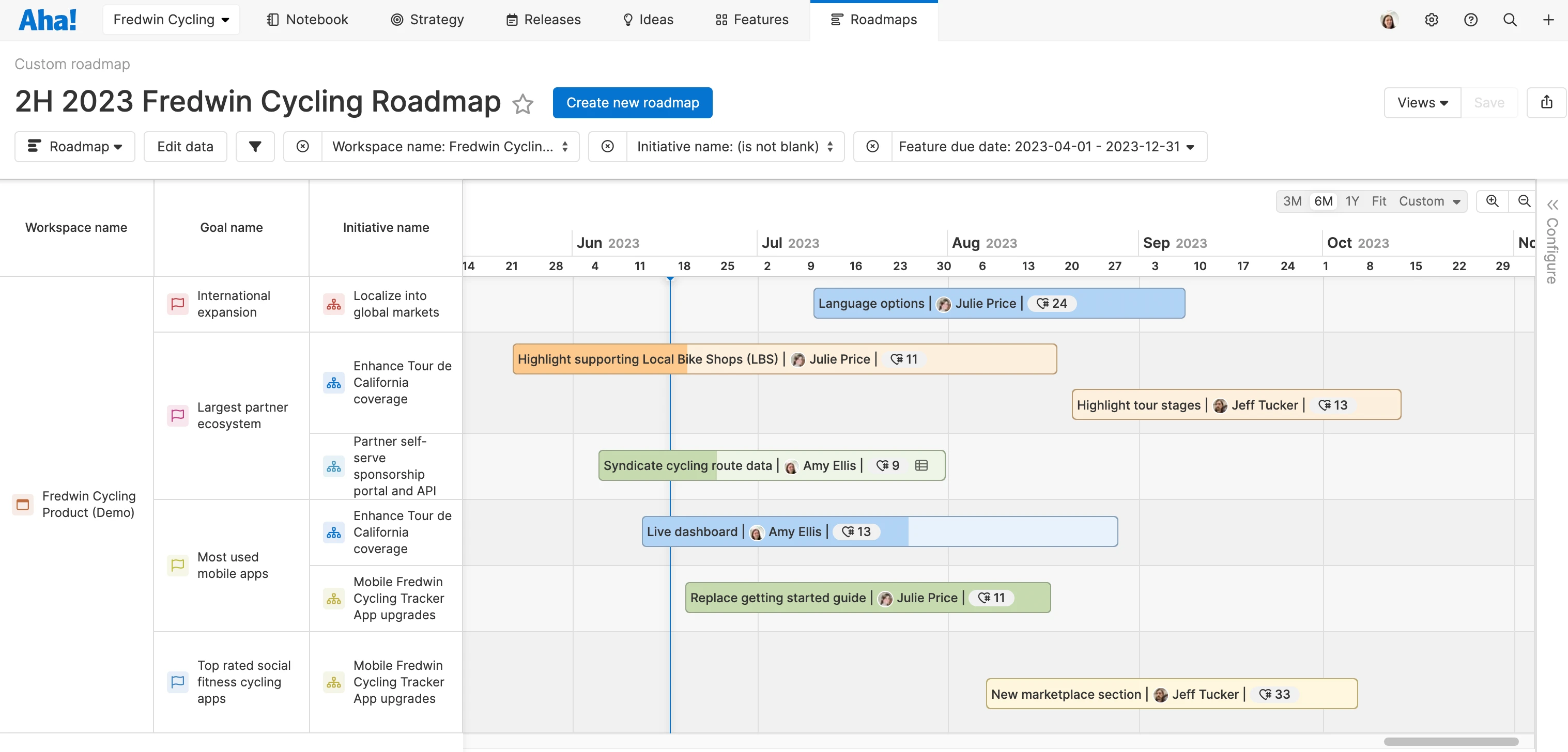 Imagine you want to create a roadmap to show your plans for the second half of 2023. You want to highlight how major features connect to your overarching goals, initiatives, and epics. The custom roadmap is perfect for this. In the example below, we are showing key details about each feature — such as assignee and product value score. With the added visual flair, we can display more details and clearly communicate our plans for the rest of the year.