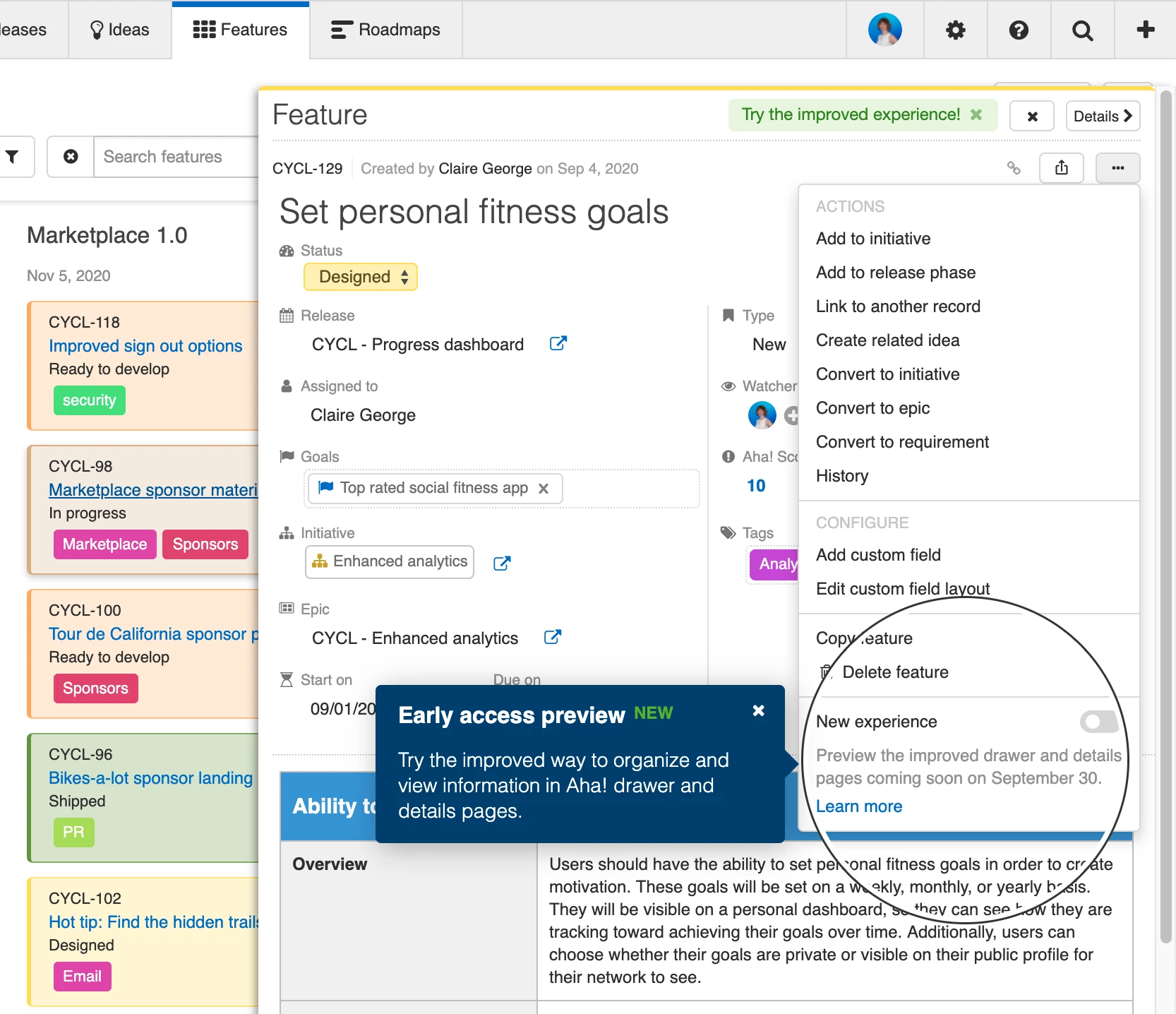 This is why we are making an early access preview available now, so you can get familiar with the new way of working in Aha! before the full launch on September 30, 2020. Give it a try and let us know what you think.