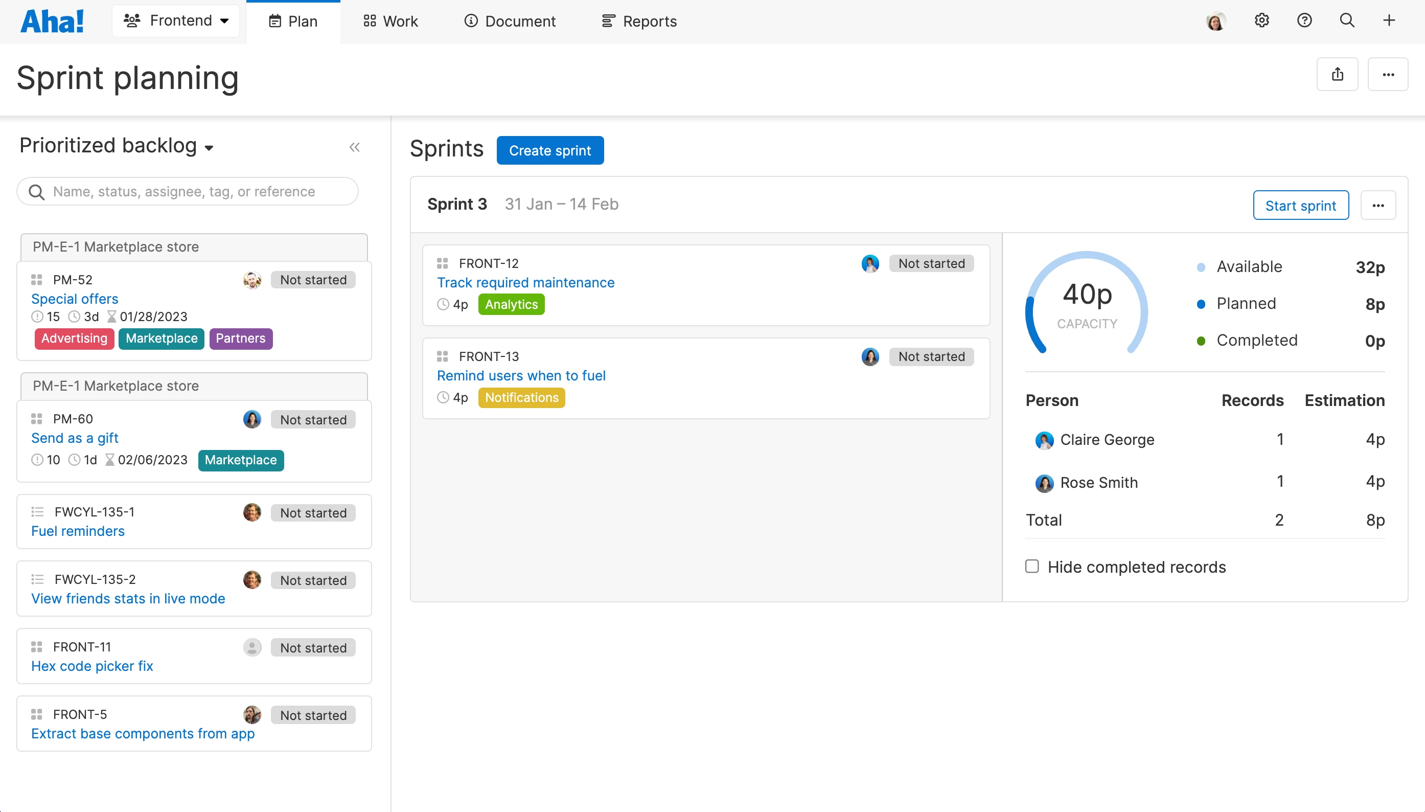 Now we want to plan our next sprint. We can see that the records we carried over from the previous sprint use eight points of our 40-point capacity. We can add additional work for the team to tackle by moving over items from the top of the prioritized backlog. And with that, sprint planning is done.