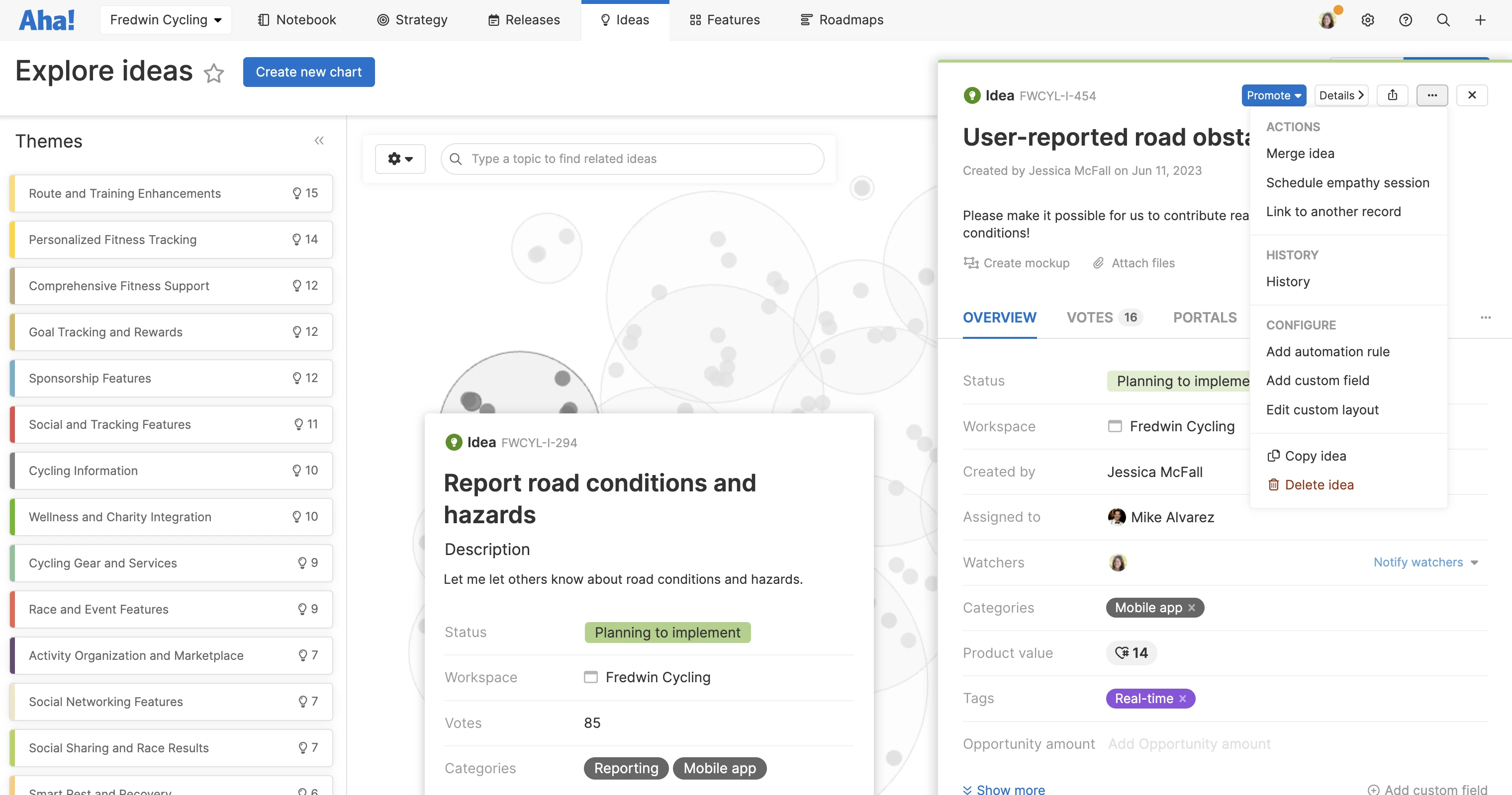 Imagine you are researching a new feature and want to find related requests. Here, we are building an integration with ebikes in our fictitious Fredwin Cycling app. We focus our ideas exploration on the "Integrations" category in our ideas portal, then search for "electric and assisted bikes" to refine the results. The matching ideas turn green — making it easy to understand what customers need, look at similar ideas nearby, and use these insights to define what to build.