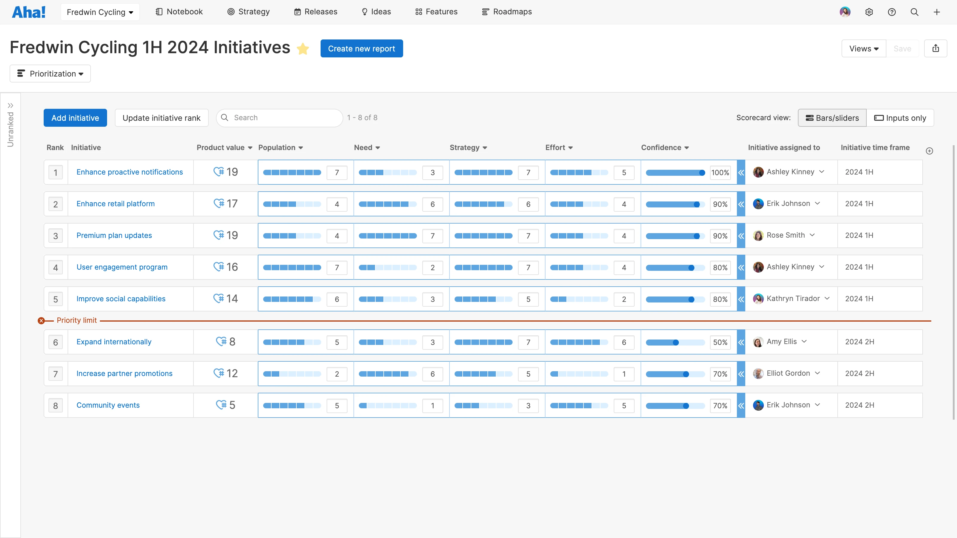 Aha! Roadmaps already includes prioritization pages for ideas, epics, and features. Customers love how easy it is to select a group of work items, update the product value score for each one, and rank them in priority order. Today's update extends this functionality to initiatives — helping you establish a clear set of strategic priorities that everyone can agree on.