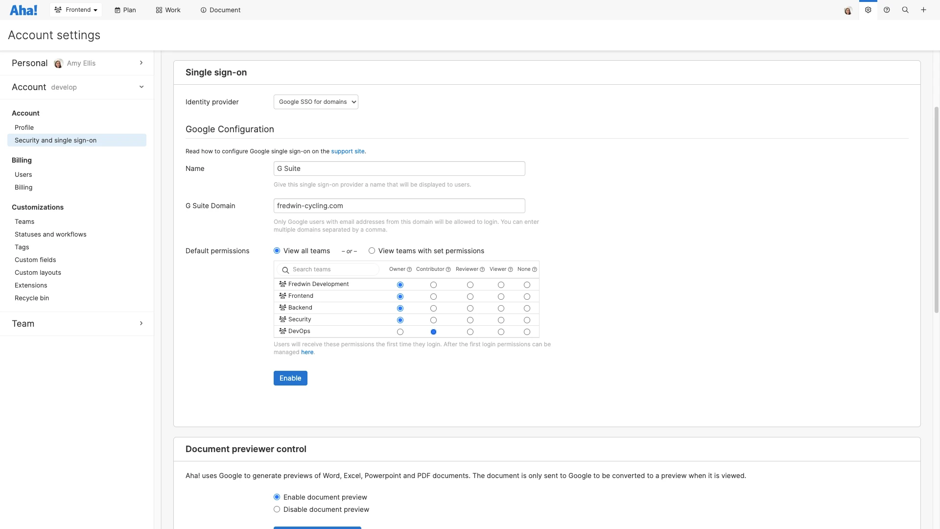 Aha! Develop supports SAML 2.0 and Google SSO for Domains