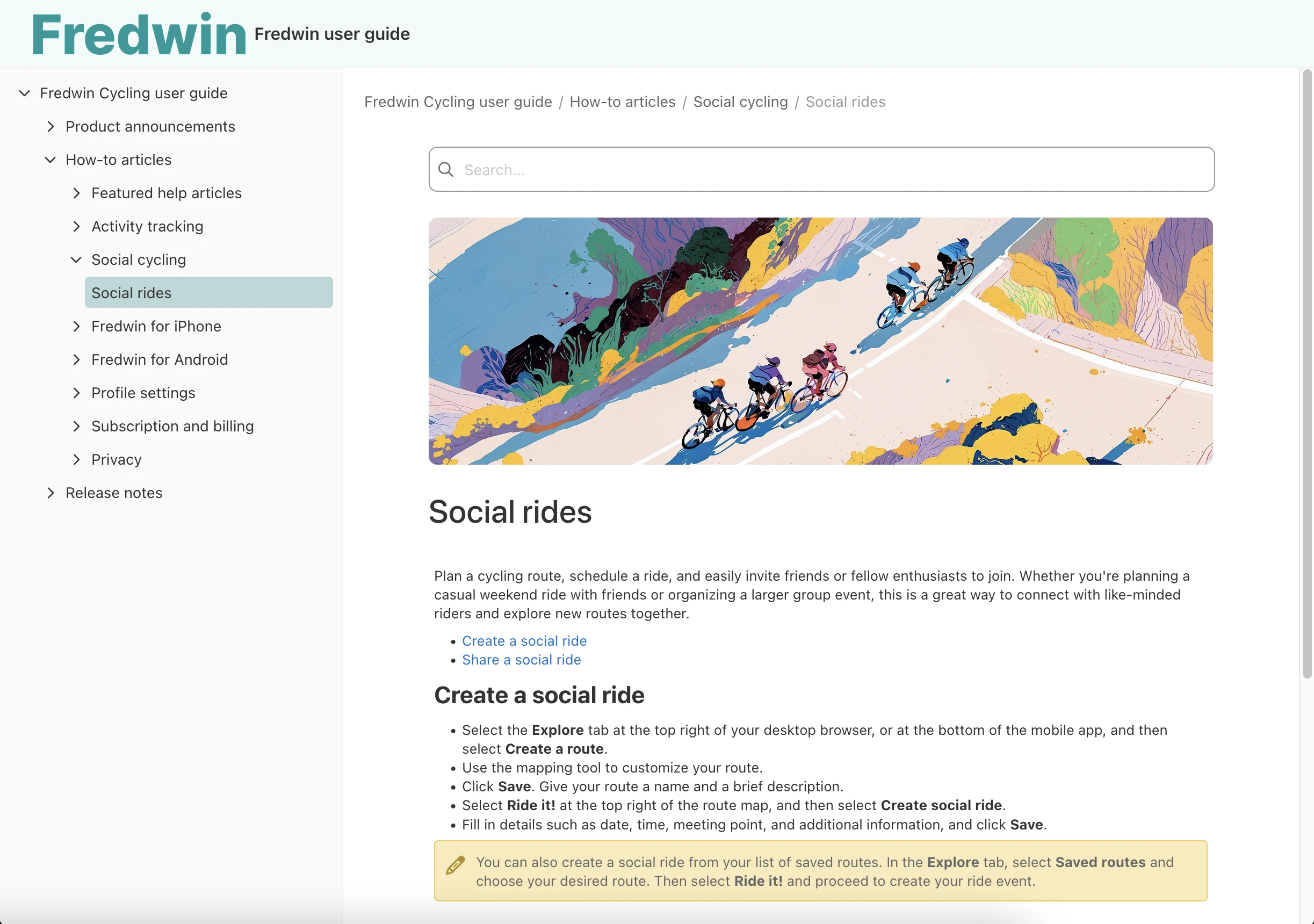 In the example below, we created a user guide for a key area of functionality in our fictitious Fredwin Cycling application. The striking header image makes the page stand out — inspiring people to read on. We will publish the guide on our product knowledge base to share it with customers. (Contact us to upgrade your account to the Aha! Knowledge Advanced plan, or reach out to schedule a demo with one of our product experts.)