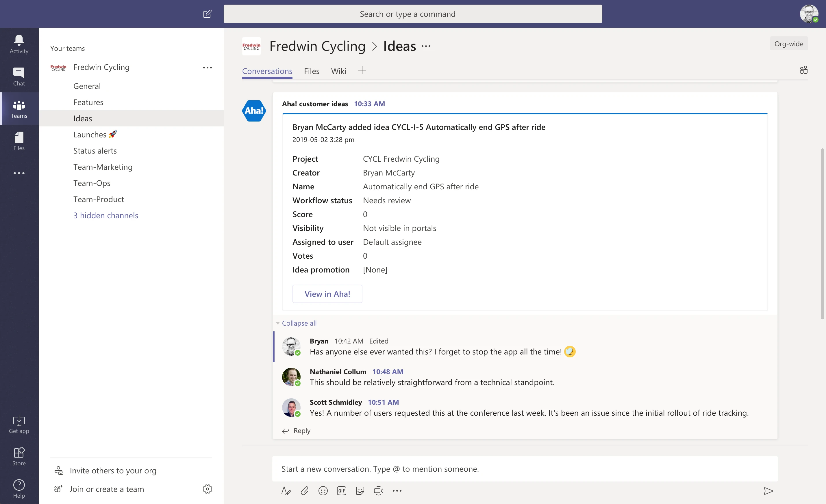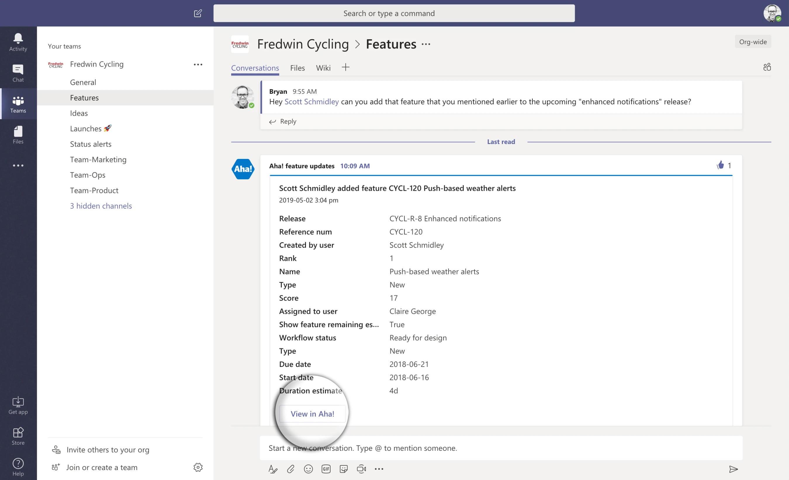 You can now have product and marketing updates sent automatically from Aha! to Microsoft Teams.