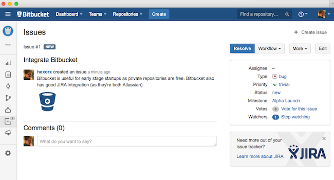 This integration allows you to push your completed features and requirements in Aha! into Bitbucket Issues. Bitbucket is is a free code DVCS hosting site for Git and Mercurial and is growing in popularity, so this integration was increasingly being requested and was an obvious addition.