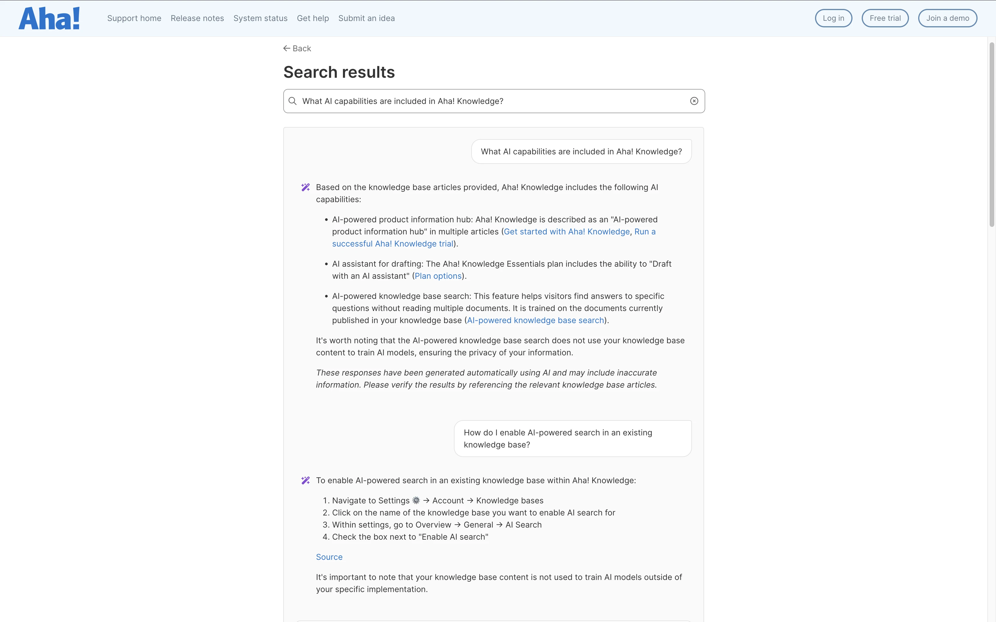 Aha! Knowledge is the AI-powered product information hub. Choose the Aha! Knowledge Advanced plan if you need to share product documentation with customers and colleagues via public or private knowledge bases. Start a free trial of Aha! Knowledge now to explore all the advanced features — including AI-powered search. Or contact us if you would like to add it to your existing Aha! Roadmaps plan.