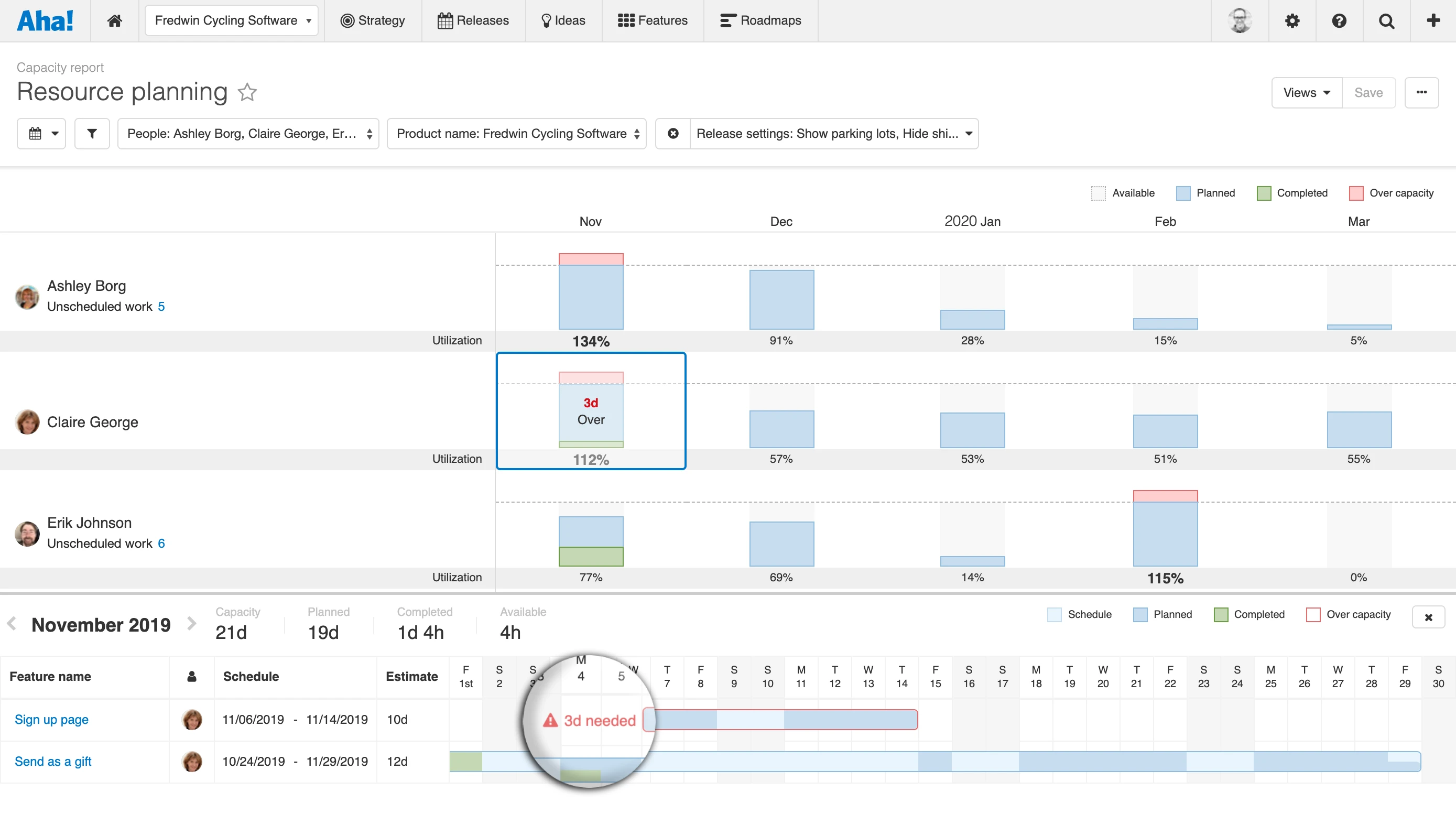 Identify resourcing challenges When someone is overcapacity, the report gives you a visual cue. A red warning shows exactly how much time is needed to get things back on track. Click the monthly column to reveal which features are assigned to an individual. Timeline bars below represent each feature and are based on feature start and due dates.