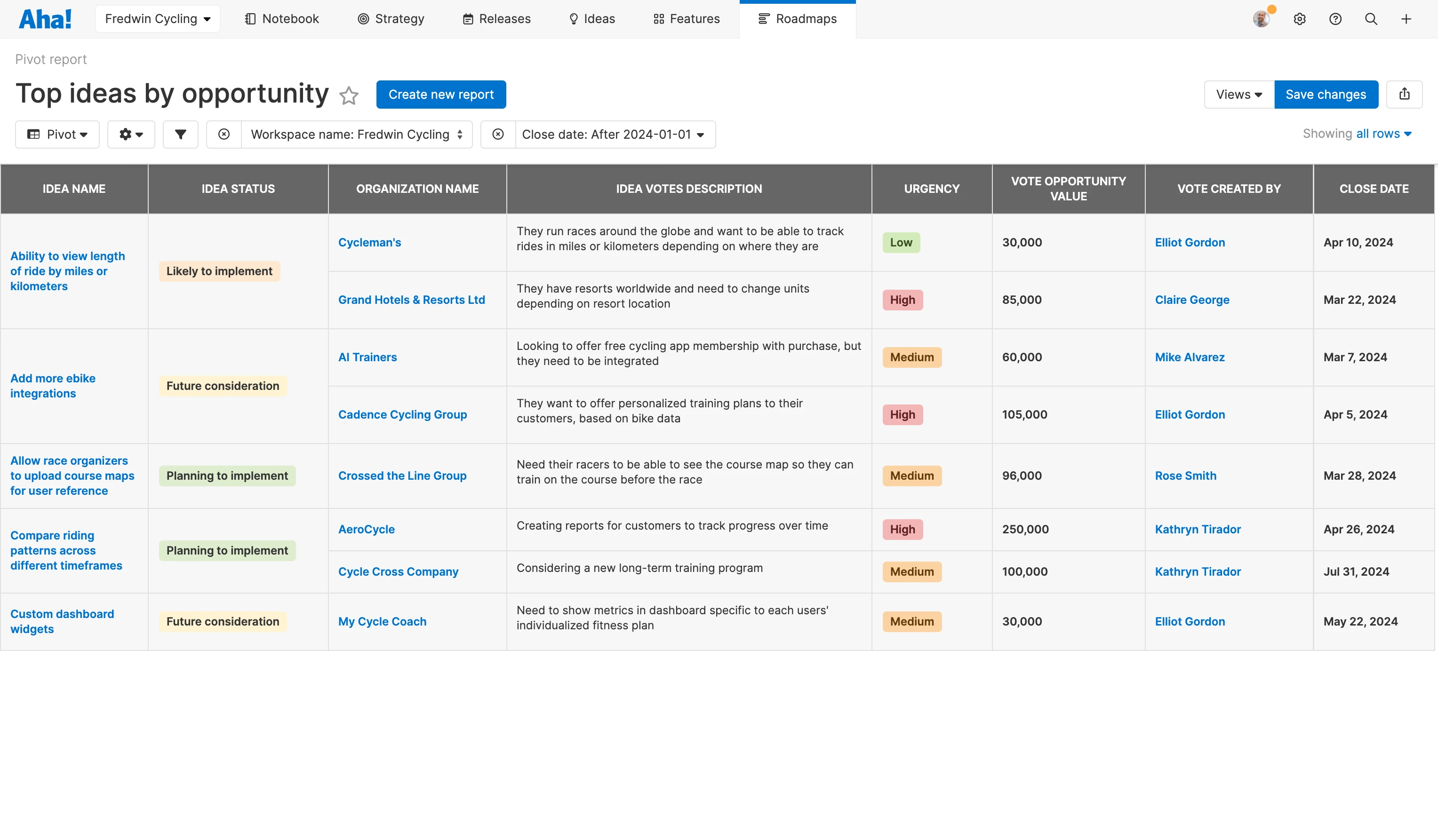 Find ideas with the biggest potential impact in your Aha! account. Here, we created a pivot report to show opportunities linked to product ideas. It is now clear which ideas are a high priority for new and existing customers. We can also see the value of those opportunities. This information can help us decide what to work on next.