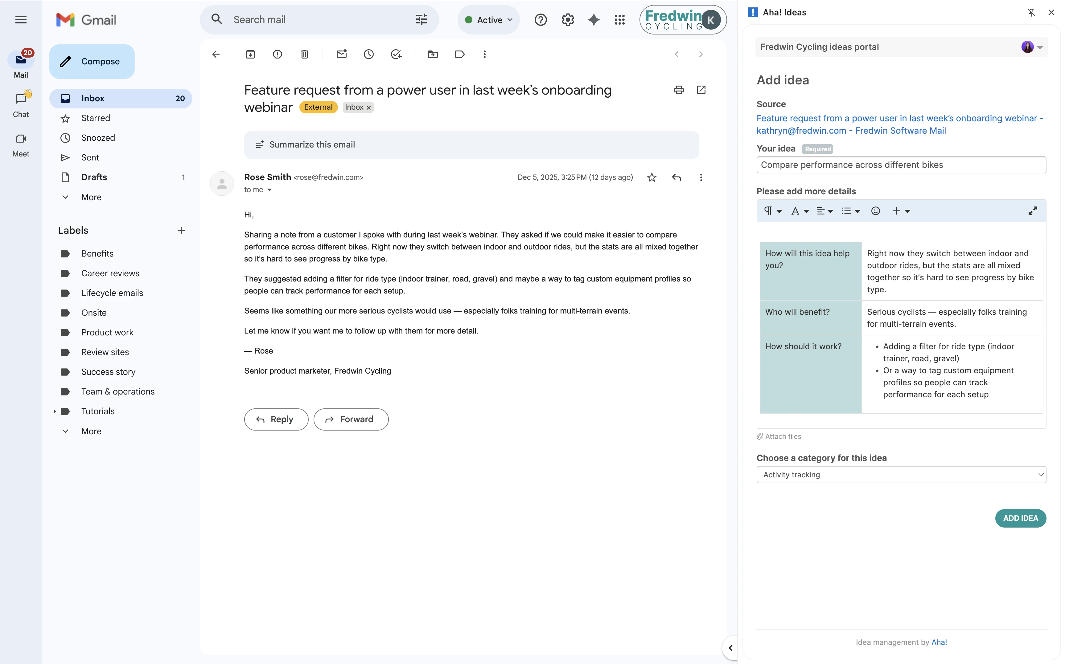 Inspiration can strike anywhere — while reading a customer email, reviewing a support ticket, or scanning an industry article. But it is easy to think, "I will go back to that later" when you are busy (and then never do). Those missed moments add up over time, and your product team loses valuable insight. You need a simple way to submit ideas to your portal without breaking focus.