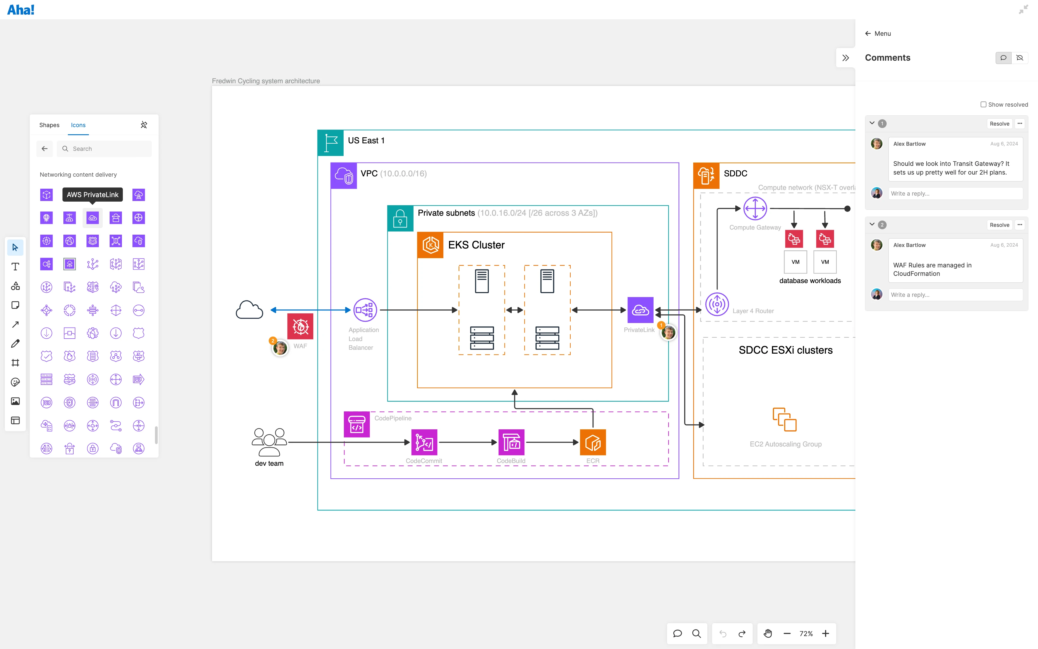 Quickly create architectural diagrams on whiteboards in Aha! software. Choose from more than 1,700 symbols representing Amazon Web Services (AWS), Microsoft Azure, and Google Cloud components.