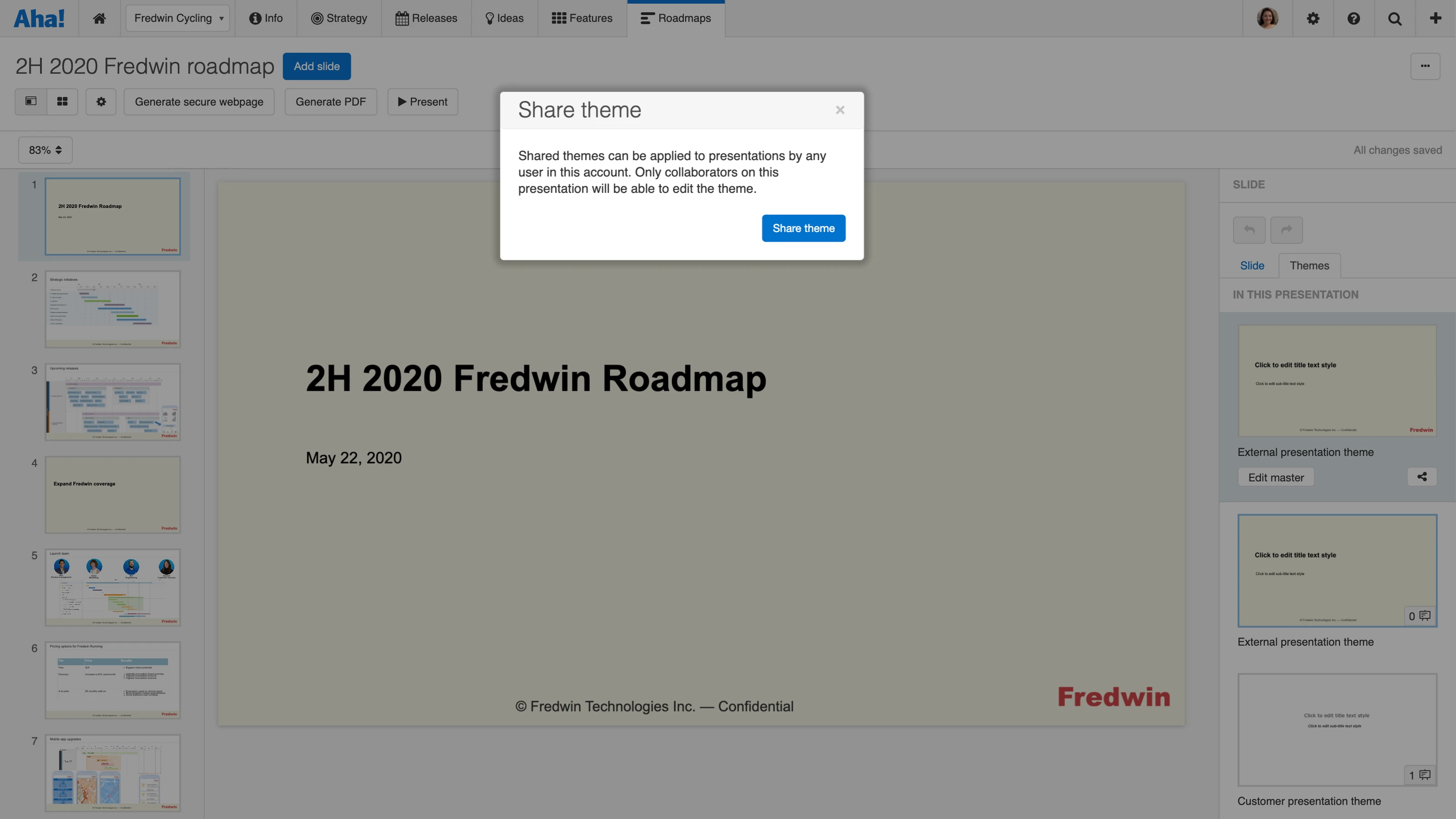 Give your theme a name and share it. Now other users in your Aha! account can quickly build presentations using the same style. As you improve your theme in the source presentation, updates are automatically applied to each linked presentation. This keeps your slides consistent — no manual updates. Note that only the creator of a theme’s source presentation and any collaborators can edit that theme.