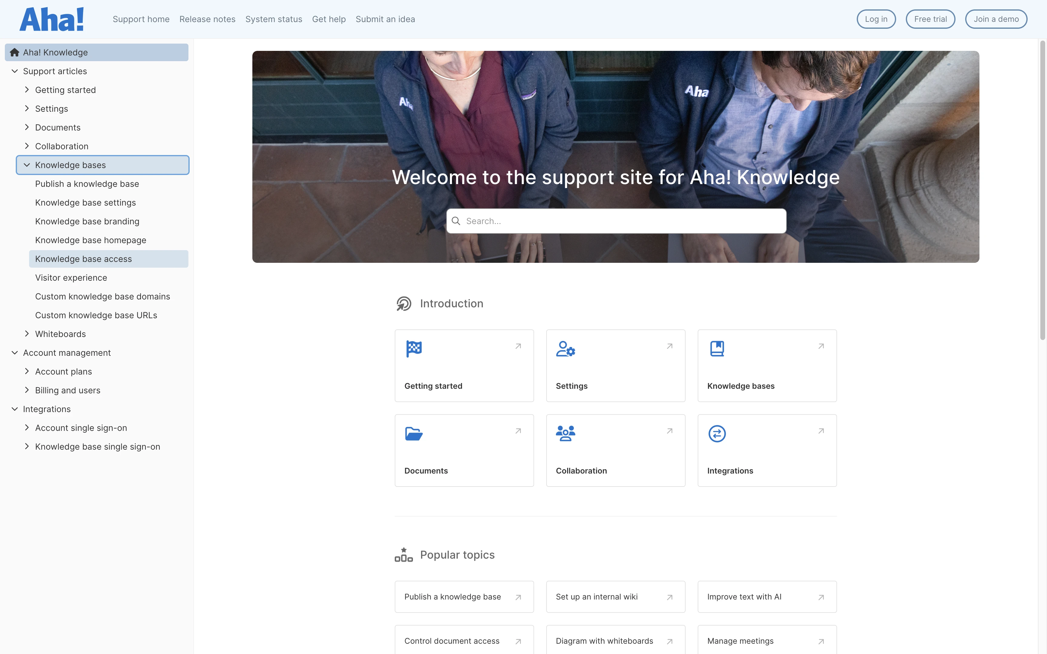 Let's start by looking at an example of a public knowledge base. If you have not already noticed, the Aha! Knowledge support site is built using Aha! Knowledge. Meta, but true. We love sharing our product expertise and guidance on how to get the most out of our software with all our customers — so making the site publicly available was a natural choice. It means we can link to it directly from our website, within our software, and in content (like this blog) to make helpful articles easy to access.