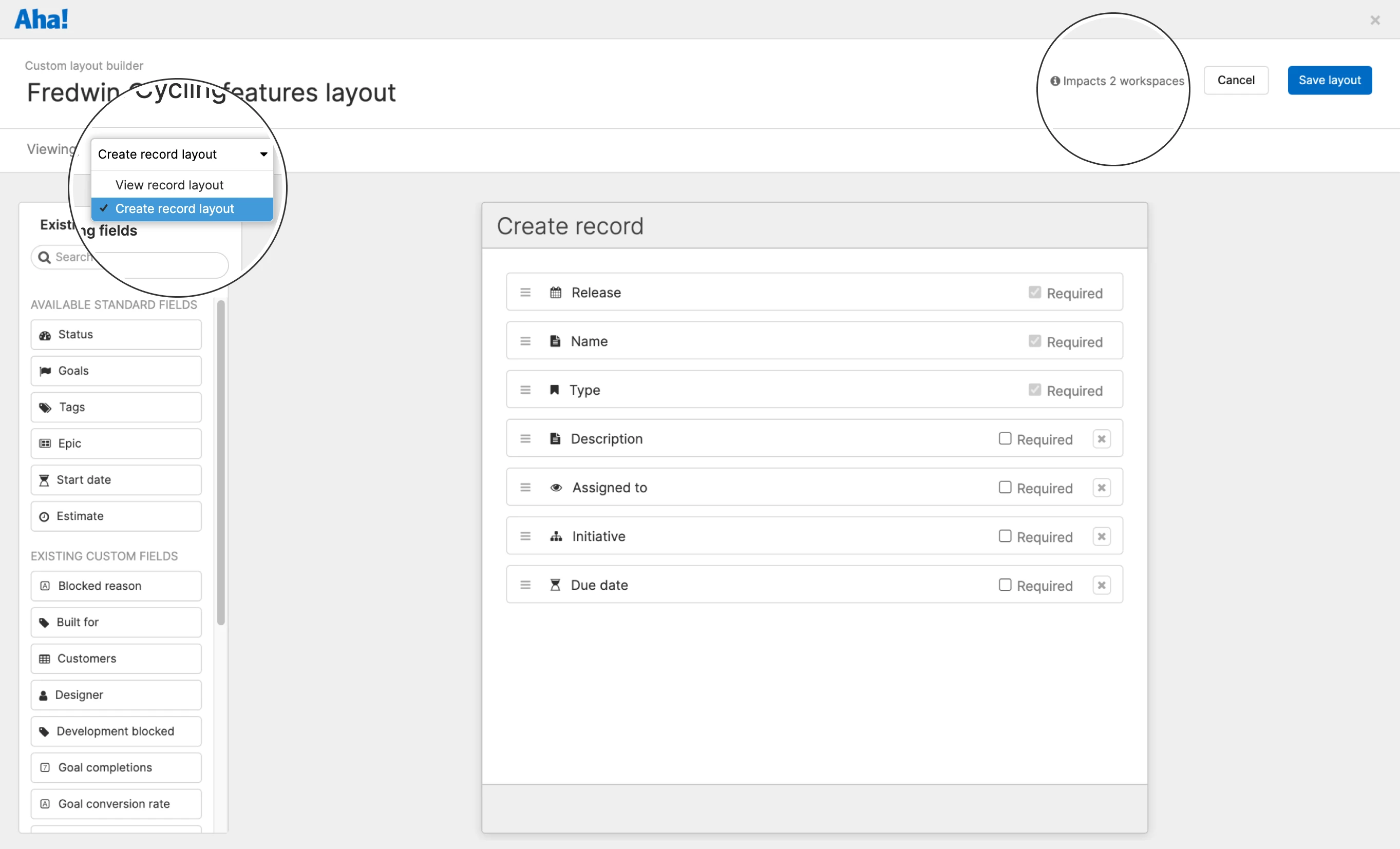 Previously, you could create and edit custom layouts for all Aha! record types. You could specify which standard or custom fields were visible when creating a new record and which custom fields a user saw when they opened a record.