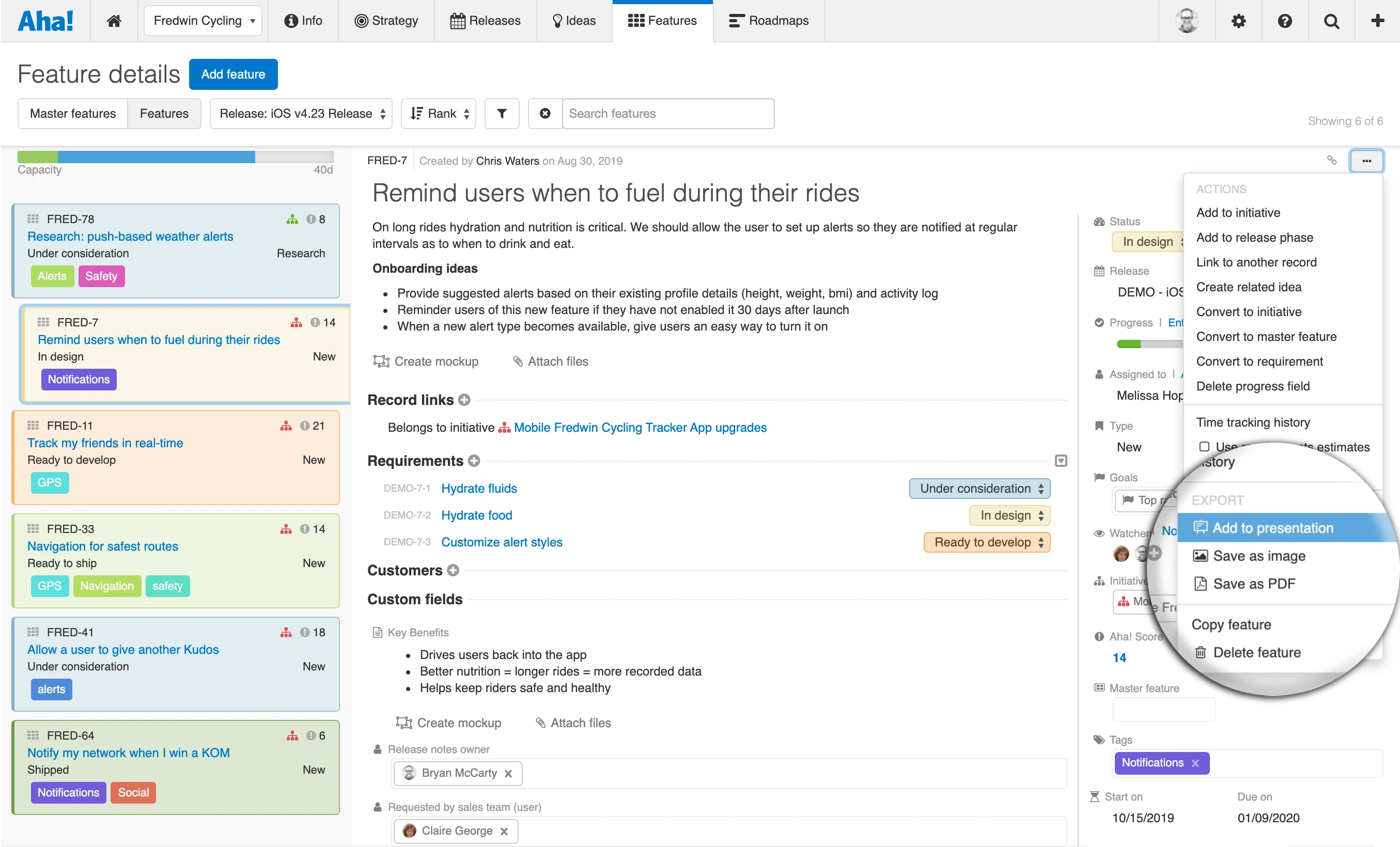 Add views to your presentation You could always add a detailed view of a specific record in Aha! to a presentation. This is a great way to provide more information about an initiative or specific work item. In the example below, we are adding a features detail page.