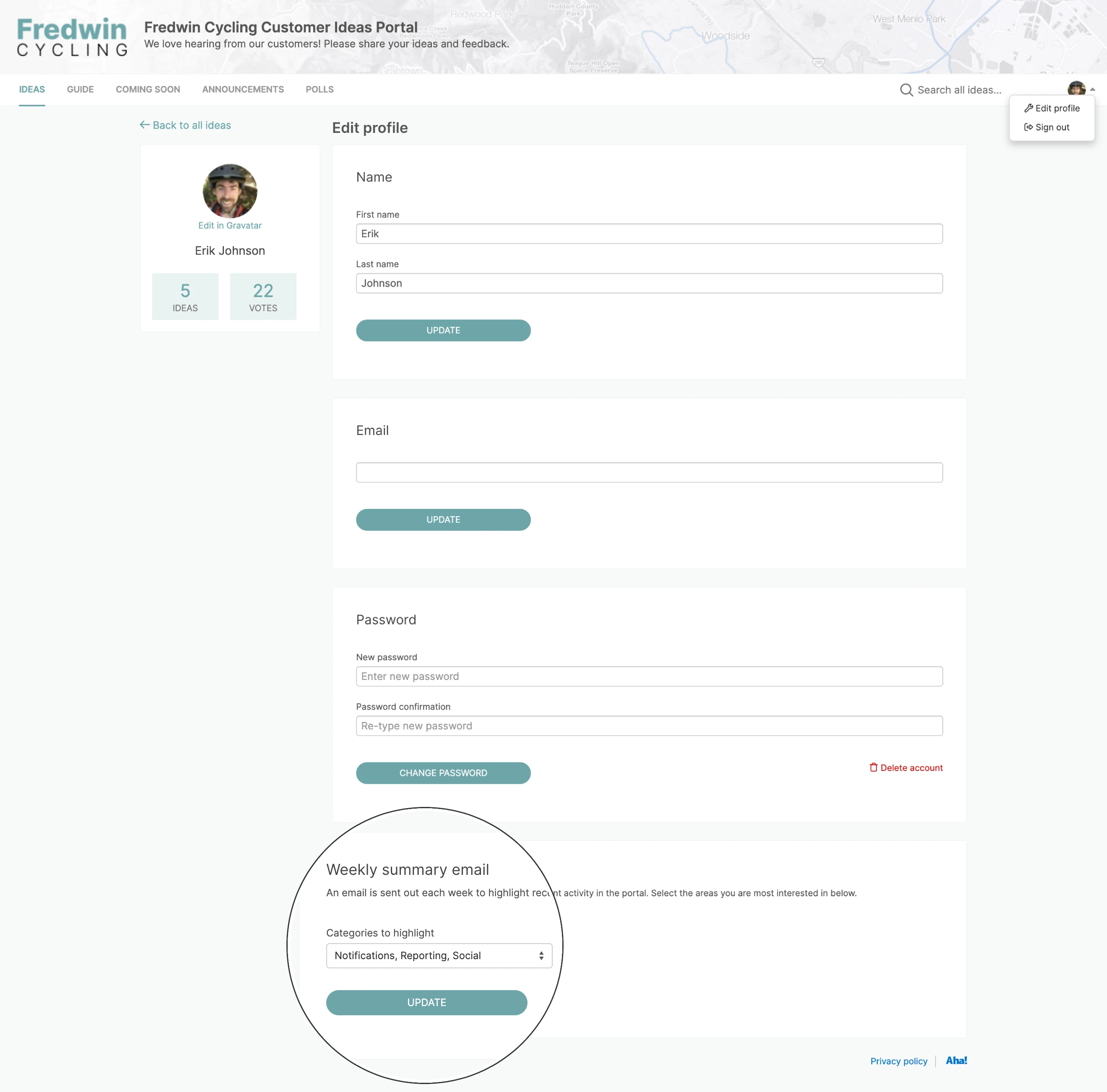 Your customers can tailor the email they receive by visiting their own profile settings in your portal. (A link to this page is included in each email.) In the example below, Erik selected three idea categories that are most interesting to him — notifications, reporting, and social. These selections will be applied to the recent ideas and new comments sections in his next email.
