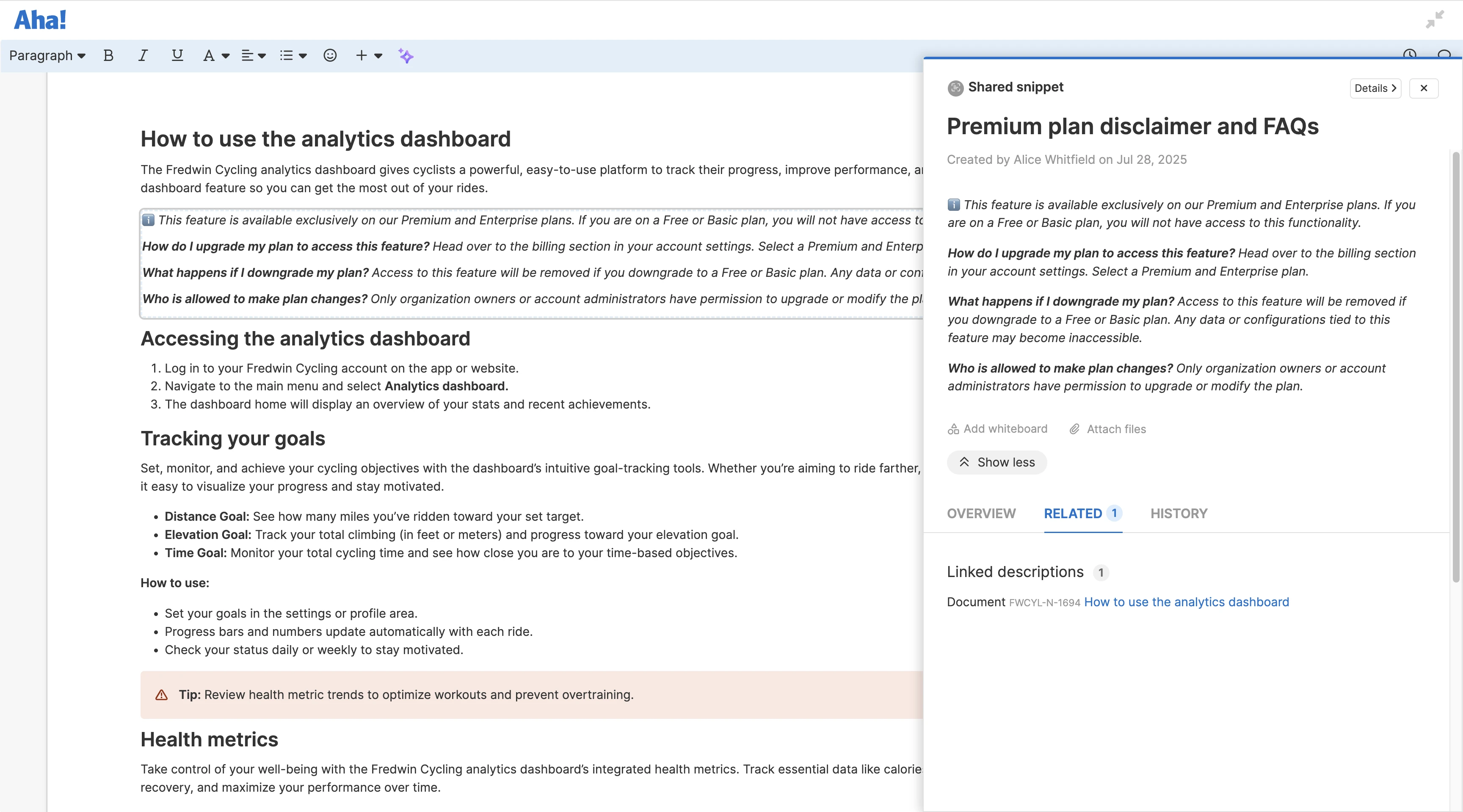 Create reusable content snippets in Aha! Knowledge for fast, accurate updates across your documentation.