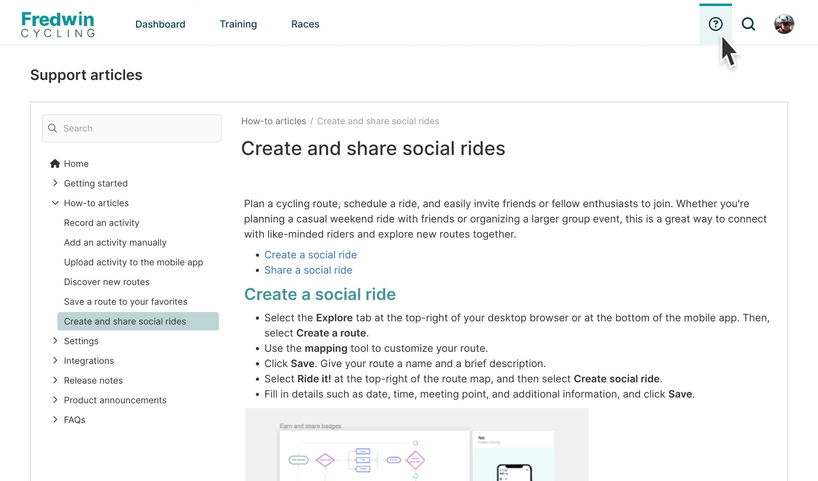 With this, your customers can easily reference your product documentation while they are actively using your software. The visitor experience is the same as if they were accessing it as a standalone site complete with a beautiful homepage, AI-powered search, and an easy-to-browse information hierarchy. Below is an example of how an embedded knowledge base looks. (For this example, we used a fictitious fitness app called Fredwin Cycling.)