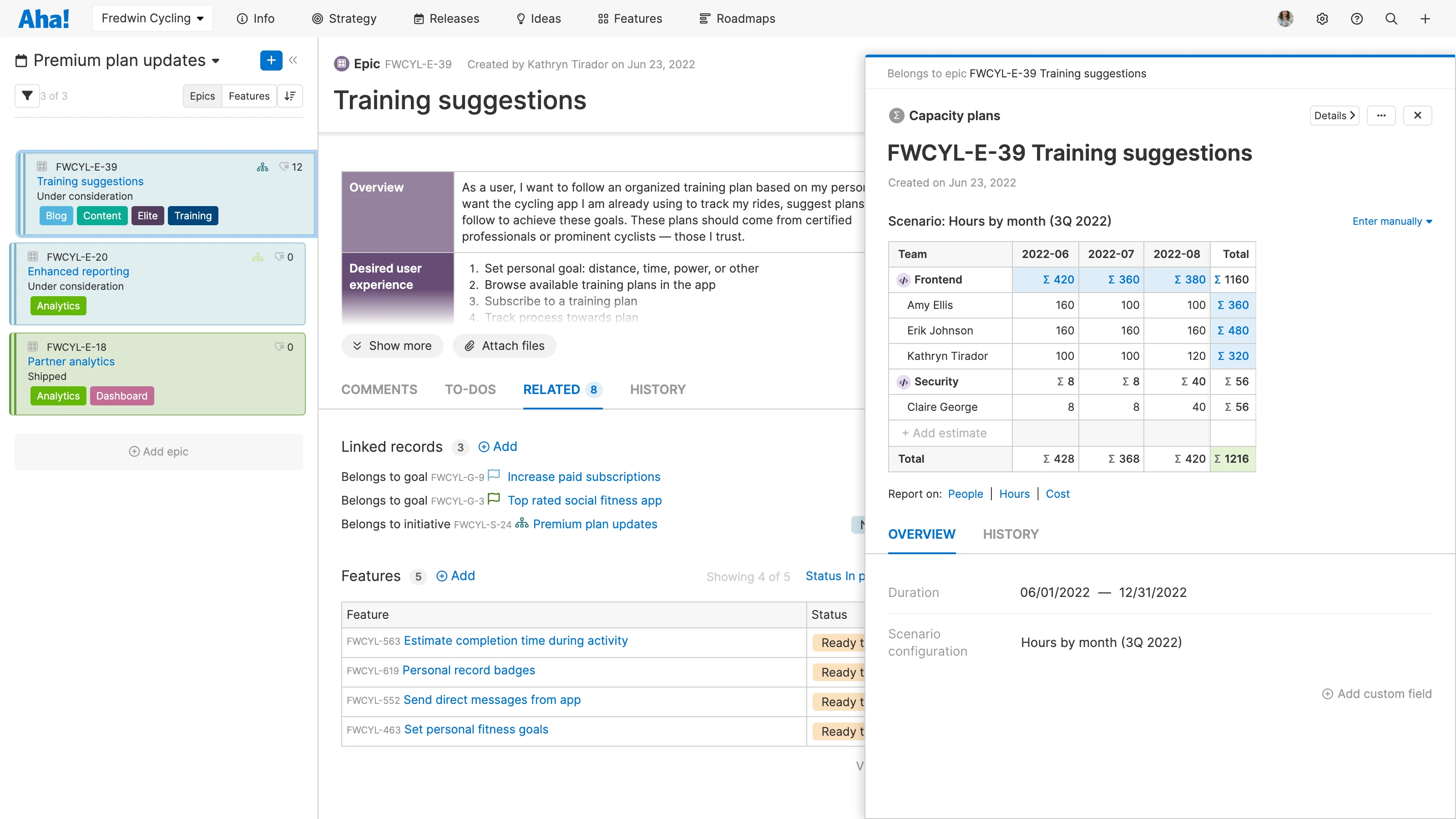 This enhancement enables customers on our Enterprise+ plan to go a level deeper during capacity planning. To get started, first create teams in your Aha! Roadmaps account and add people to them. Once added, you can specify team members as you capture advanced estimates. Then use the capacity report to visualize the workload by team and team member each month — so you can quickly identify resource constraints and reallocate people as needed.