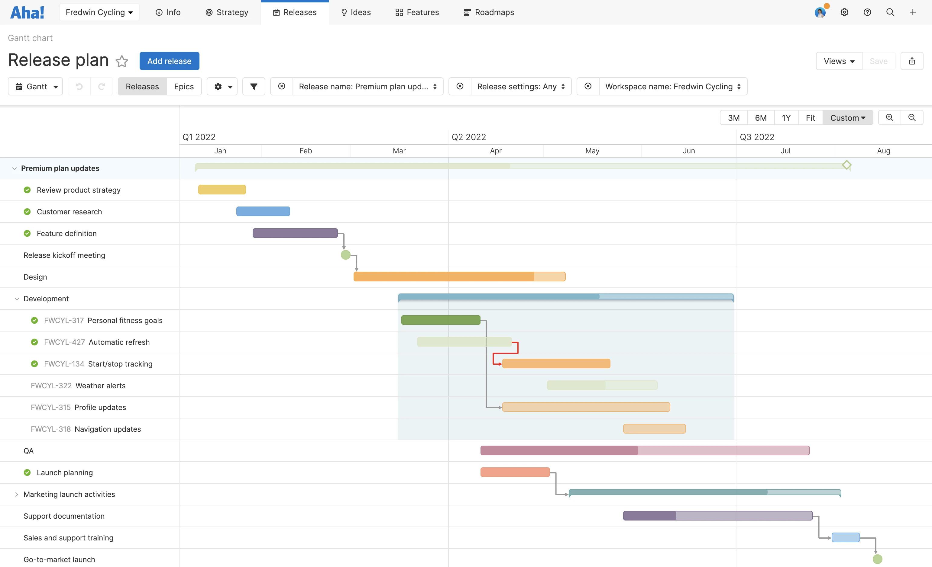 This is one reason we designed all views in Aha! Roadmaps (including Gantts and kanban boards) to be dynamic. (We also offer kanban board views in Aha! Develop for engineering teams.) Features connect directly to their corresponding goals and initiatives, and any charts or boards you use update in real time. We have seen firsthand how accuracy and transparency bring greater alignment and achievement — teams can focus on collaborating on the work that will bring the most impact to the business.