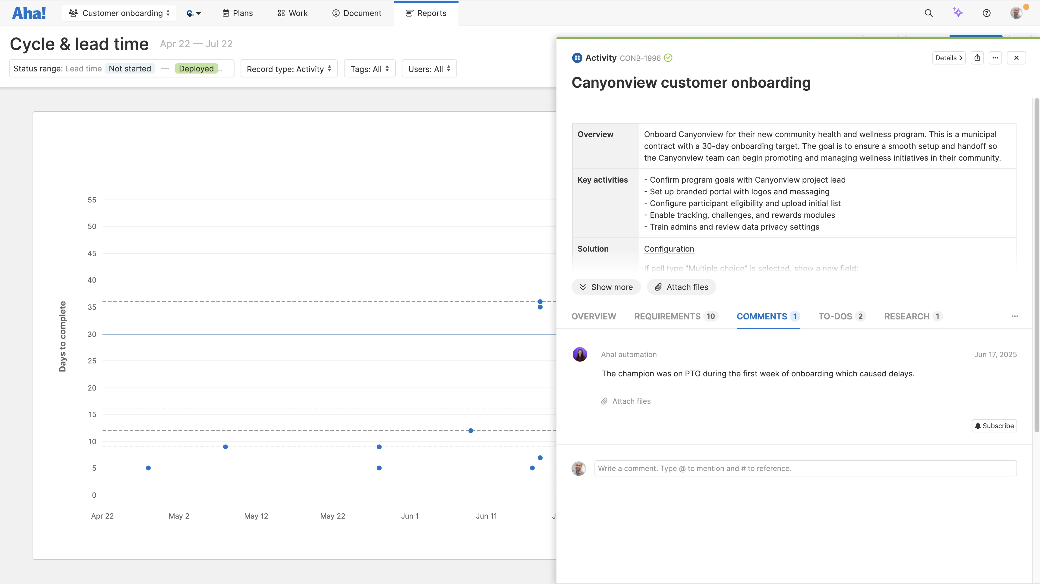 The cycle and lead time report is available to Aha! Teamwork and Aha! Develop customers. Aha! Teamwork is the flexible project management tool. Complete all tasks, streamline workflows, and increase visibility. Aha! Develop helps agile development teams connect to the roadmap, optimize workload, and streamline delivery. Use Aha! Teamwork or Aha! Develop with Aha! Roadmaps to keep operations, IT, marketing, and engineering teams aligned with your overall strategy. Sign up for a free 30-day trial or join a live demo to see why more than 1 million product builders trust our software to build lovable products and be happy doing it.