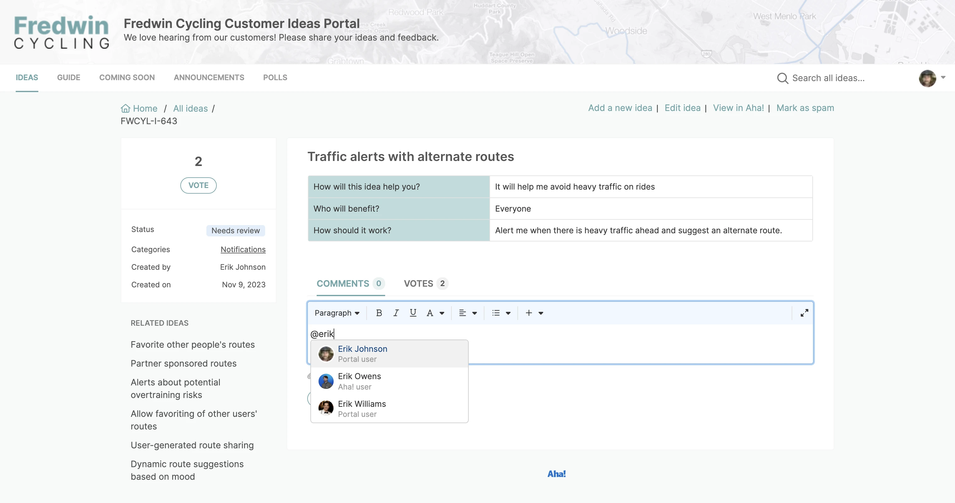 How many times have you @mentioned a teammate today? With so many digital channels for communication, proactively mentioning other people is a natural way to get someone's attention. You can already @mention teammates in Aha! software — and now, you can do the same for both teammates and users in your ideas portal.