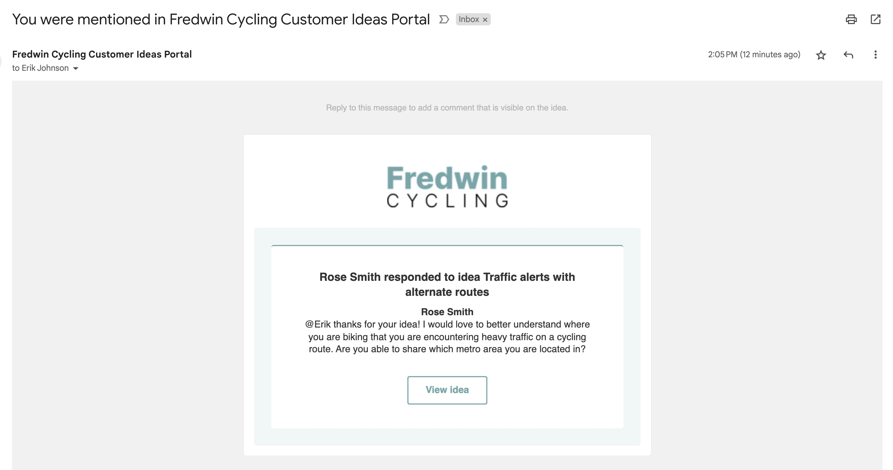 Ping! Your customer will receive an email notification that you mentioned them in the ideas portal. They can reply directly to the email or click to go straight to the idea's comment and respond in the thread. Once they reply, you will receive an Aha! notification.