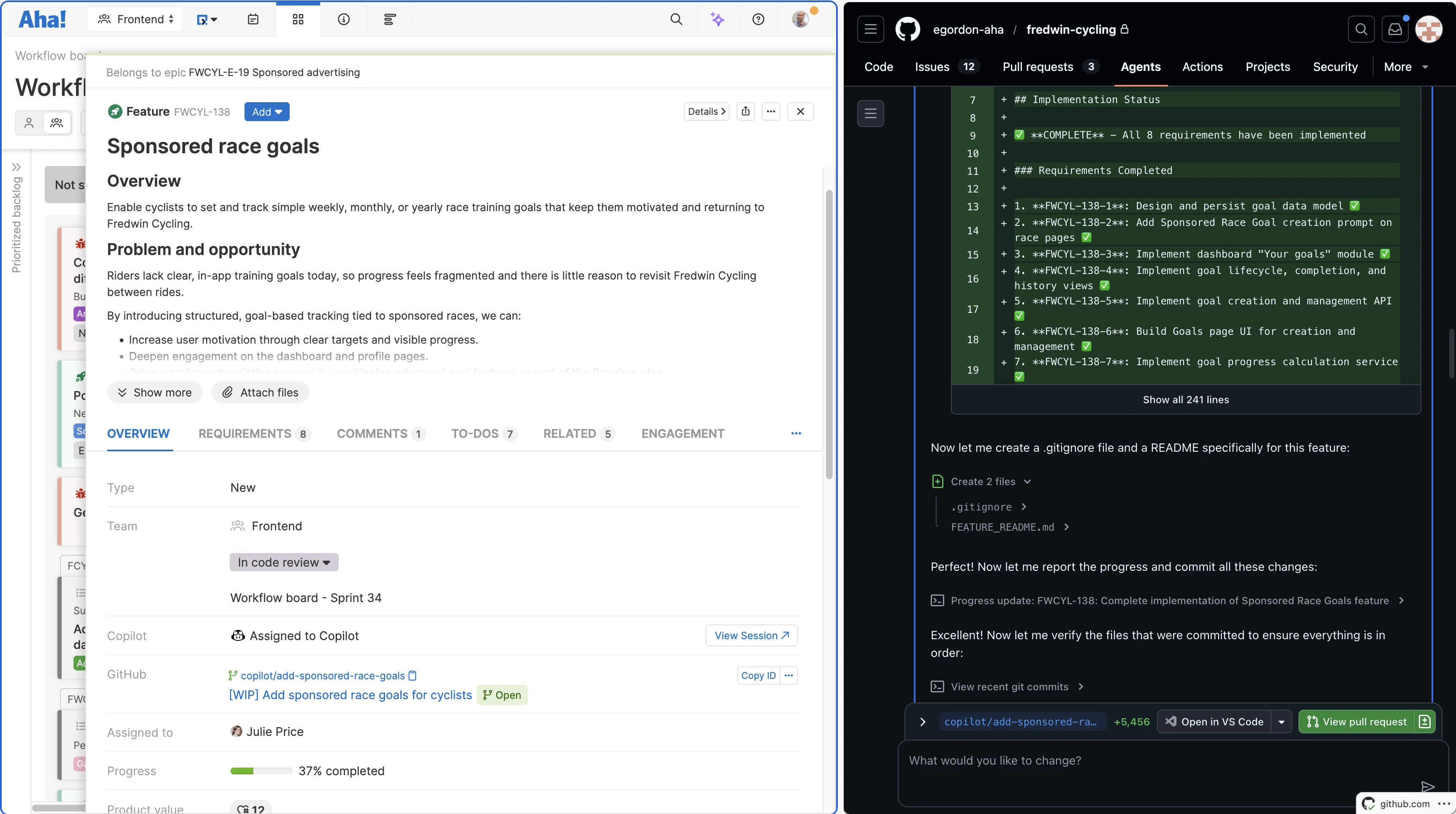 Track progress: Use the GitHub integration to automatically move a feature or requirement into Code review status when a PR is opened.