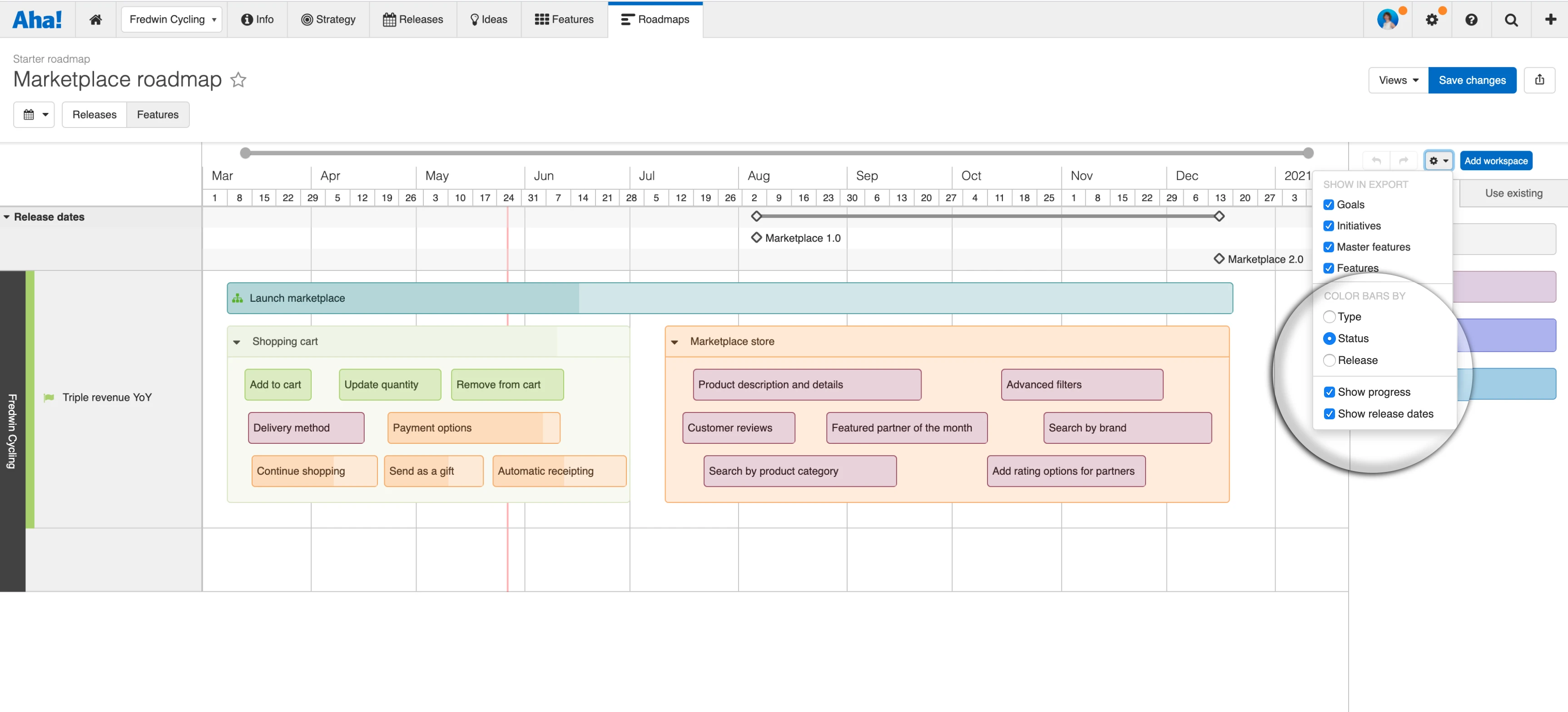 Statuses in Aha! update automatically as the engineering team completes work in Jira. In the example below, we colored the bars on the starter roadmap by status and enabled the option to show progress. As development proceeds, you have instant visibility into the status of your plans so you can see if you are on track to meet your launch date.
