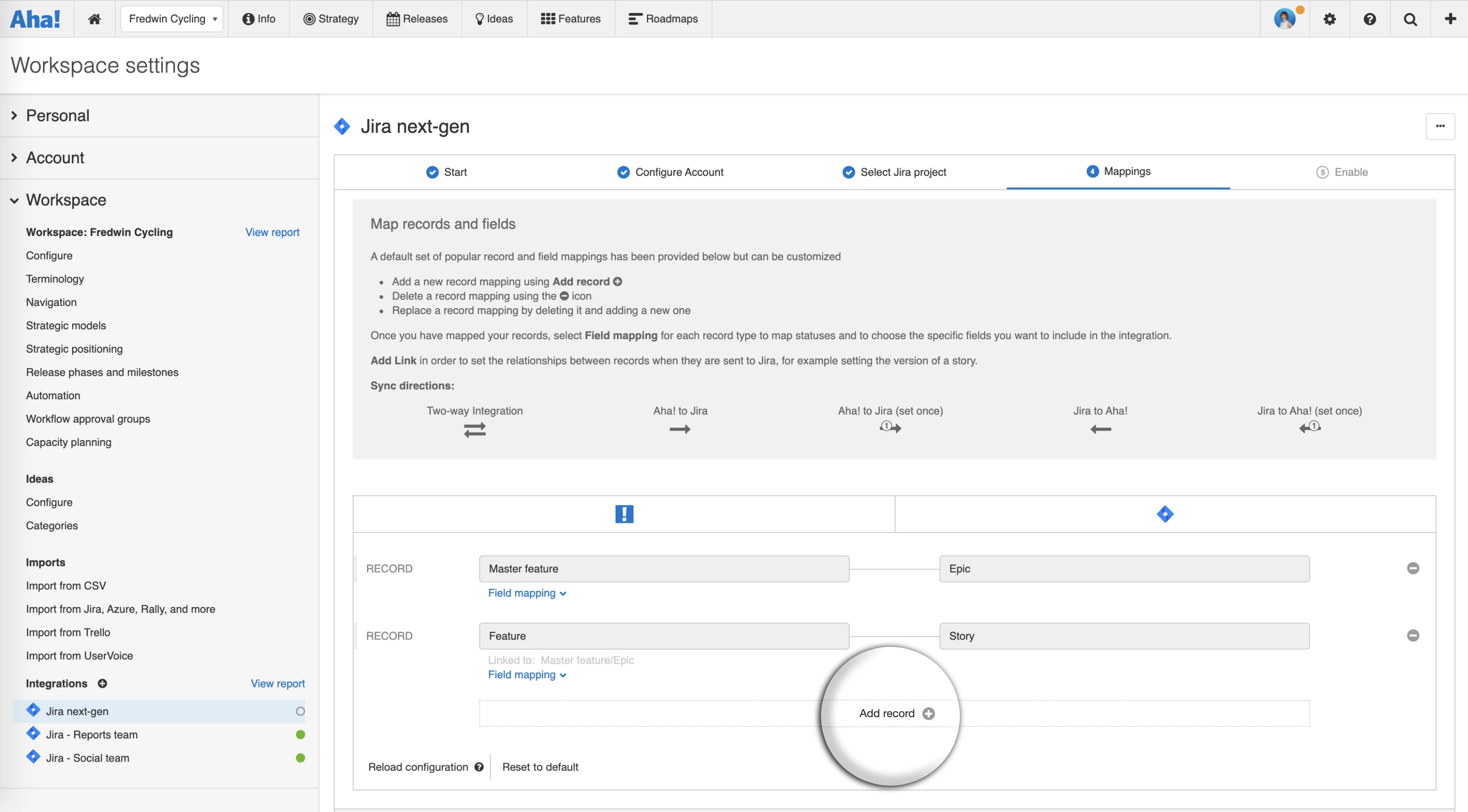 When you add a new integration, simply select the project in Jira where issues will be created. Aha! will automatically detect the project type and create default record mappings between the two systems to help you quickly get started.