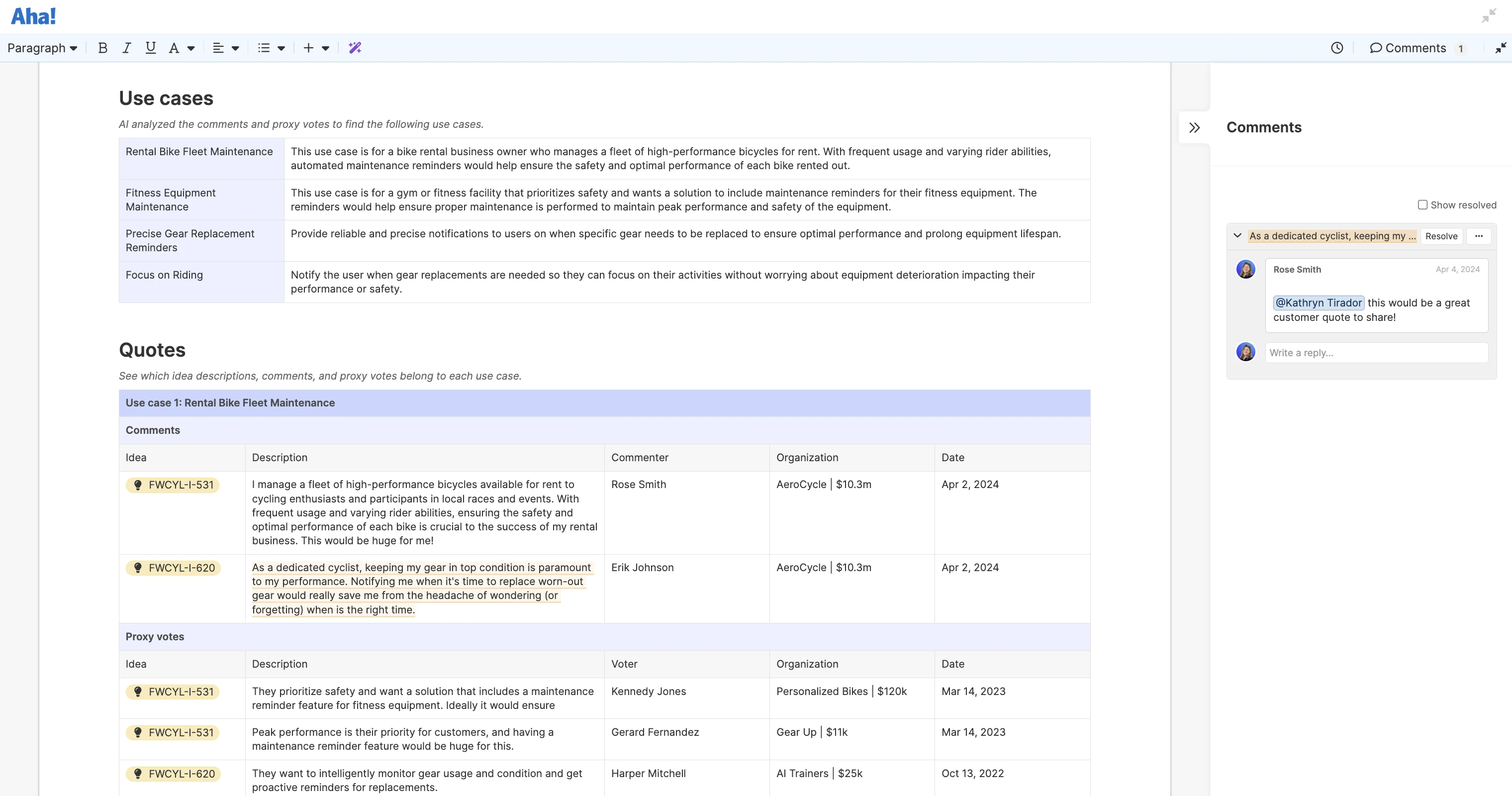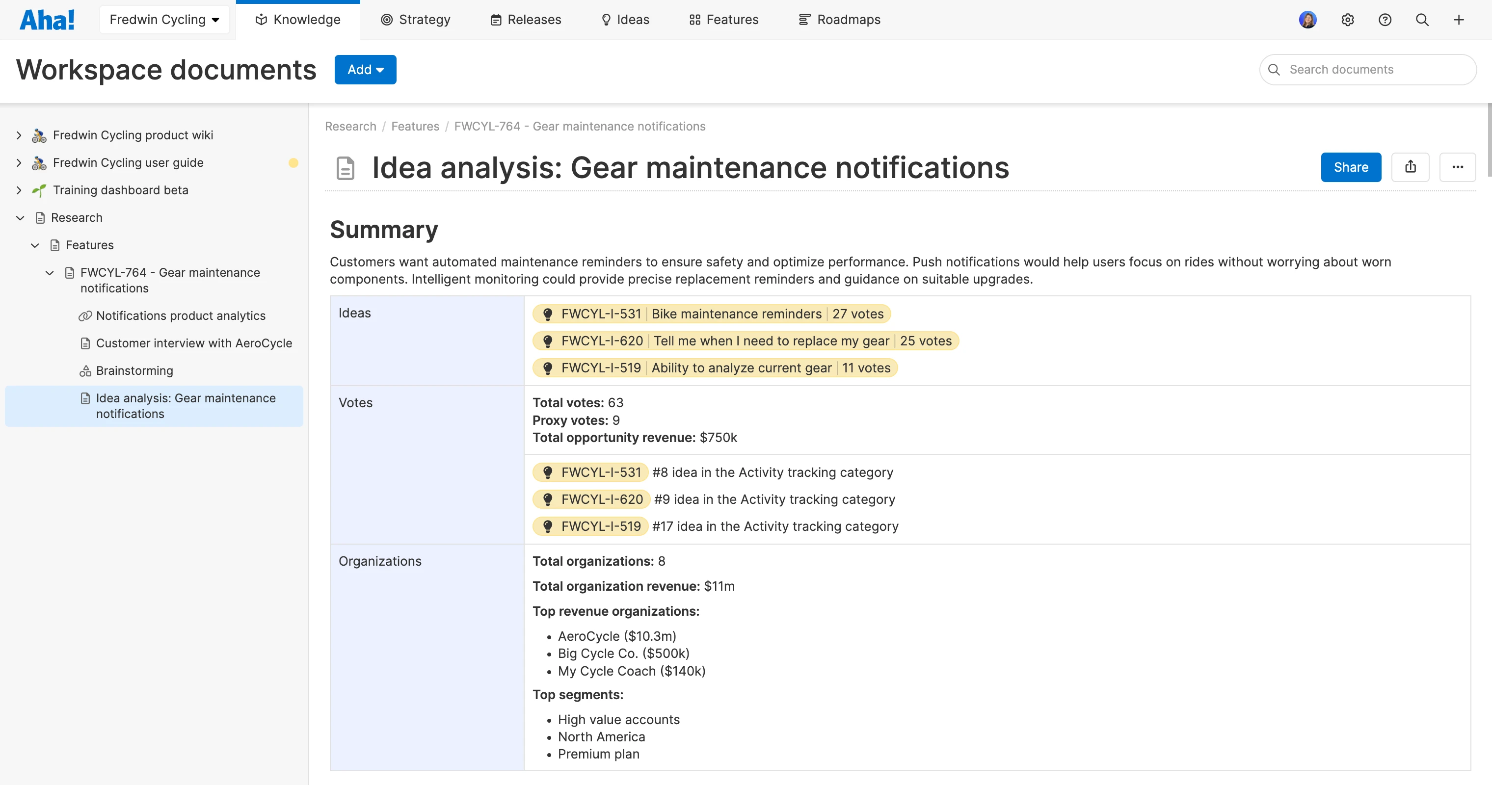 Find the new Analyze with AI option in the Ideas section of the Research tab. Let AI comb through related ideas for you, including comments and proxy votes. It will quickly generate a structured note with a summary of the ideas, their popularity, potential revenue, key use cases, and more. All of this rich information will help you understand what customers need without having to read through each individual idea's details.