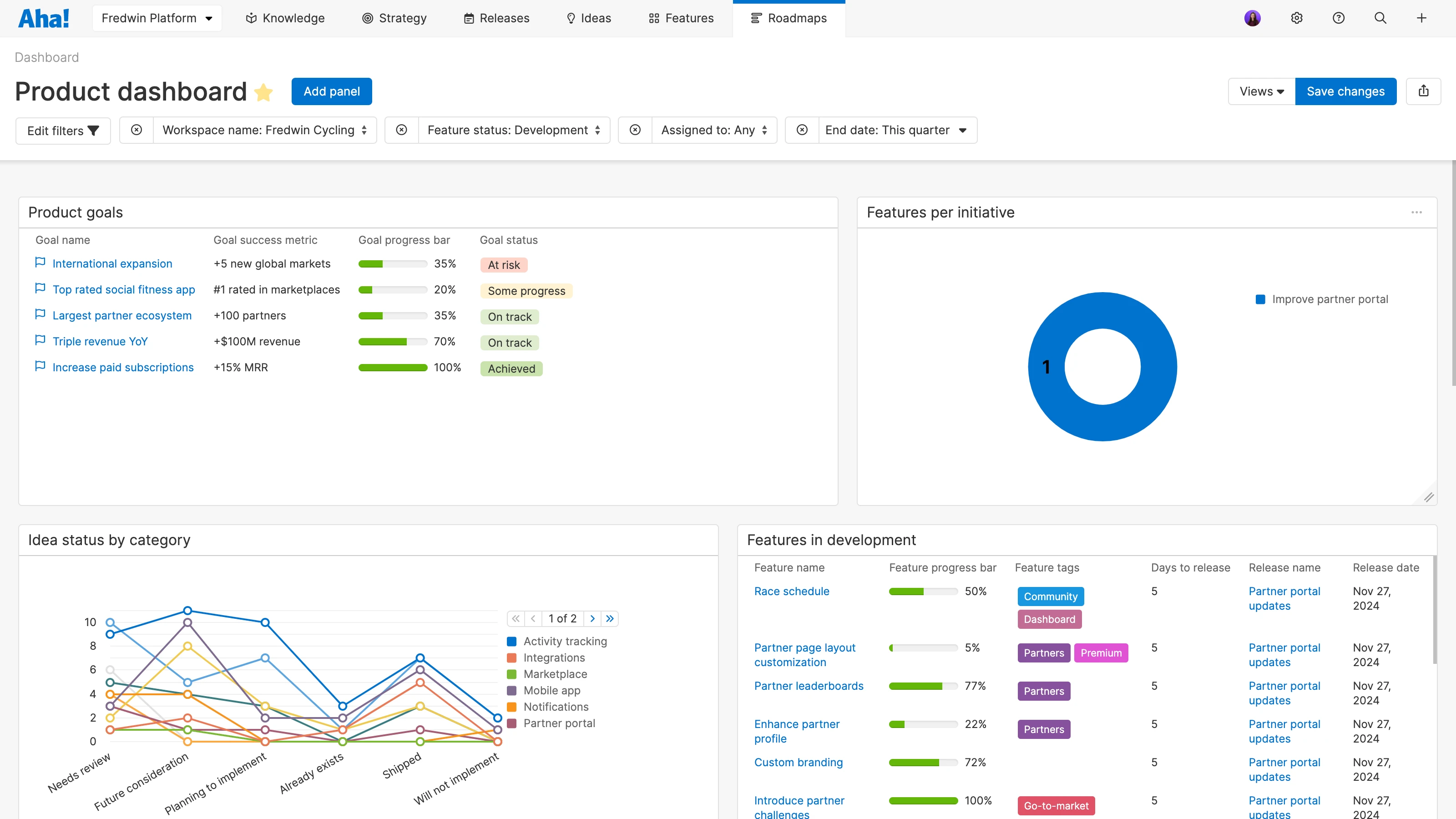 Once the dashboard is set up, each team can filter the data to meet its needs. For example, we filter by the "Fredwin Cycling" workspace, an end date of "This quarter," and "In development" feature status below to see in-progress work for the current quarter. This gives everyone a clear view of the work that matters for their particular objectives and timelines.