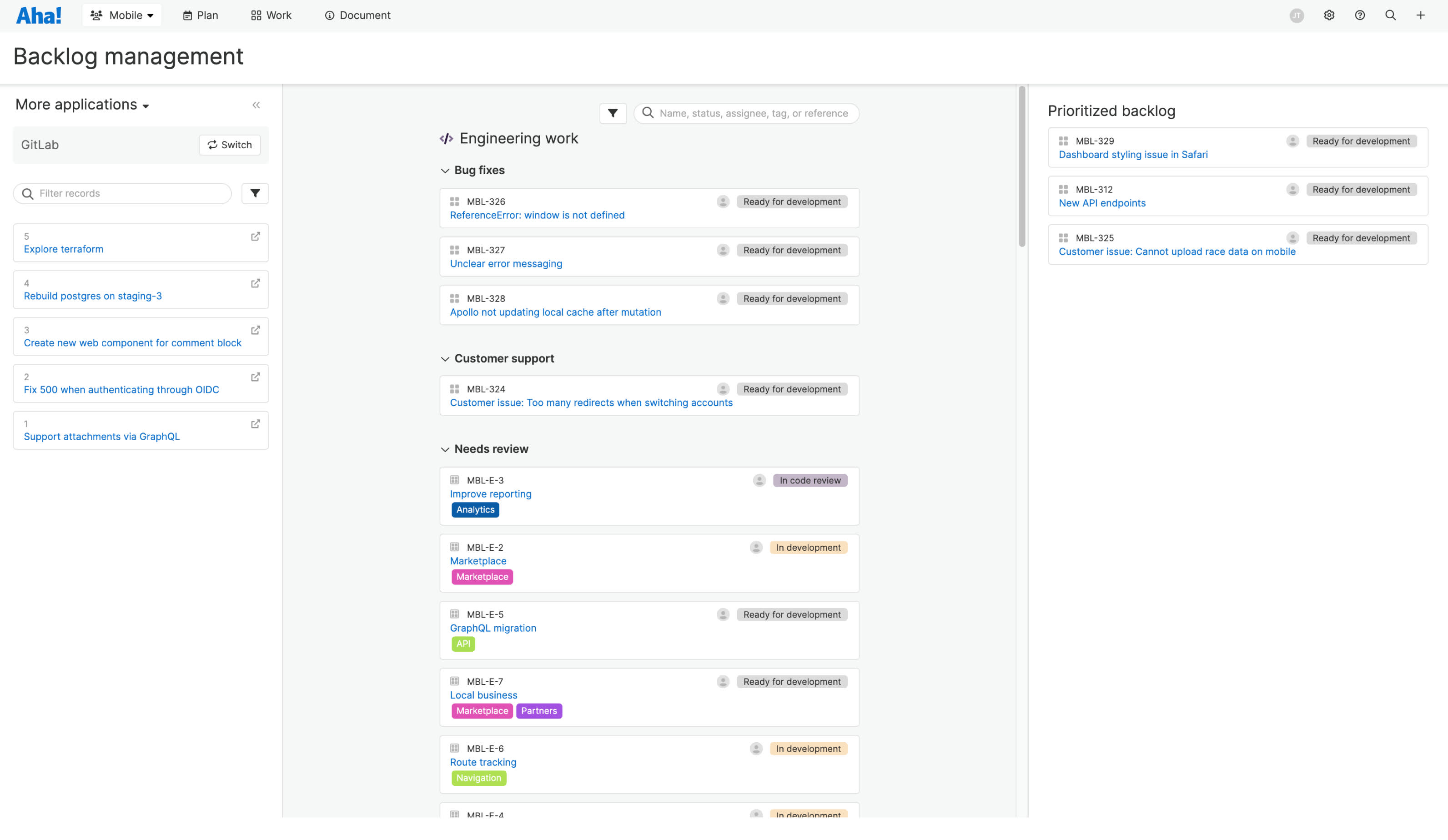 Every engineering team has its own ecosystem of tools. At a minimum, you need a tool to plan your work and another to manage the code. And it helps if those tools are connected — so you can move quickly between them and keep everyone informed of progress. Today we are happy to introduce two new extensions that make it easier to connect Aha! Develop with GitLab.