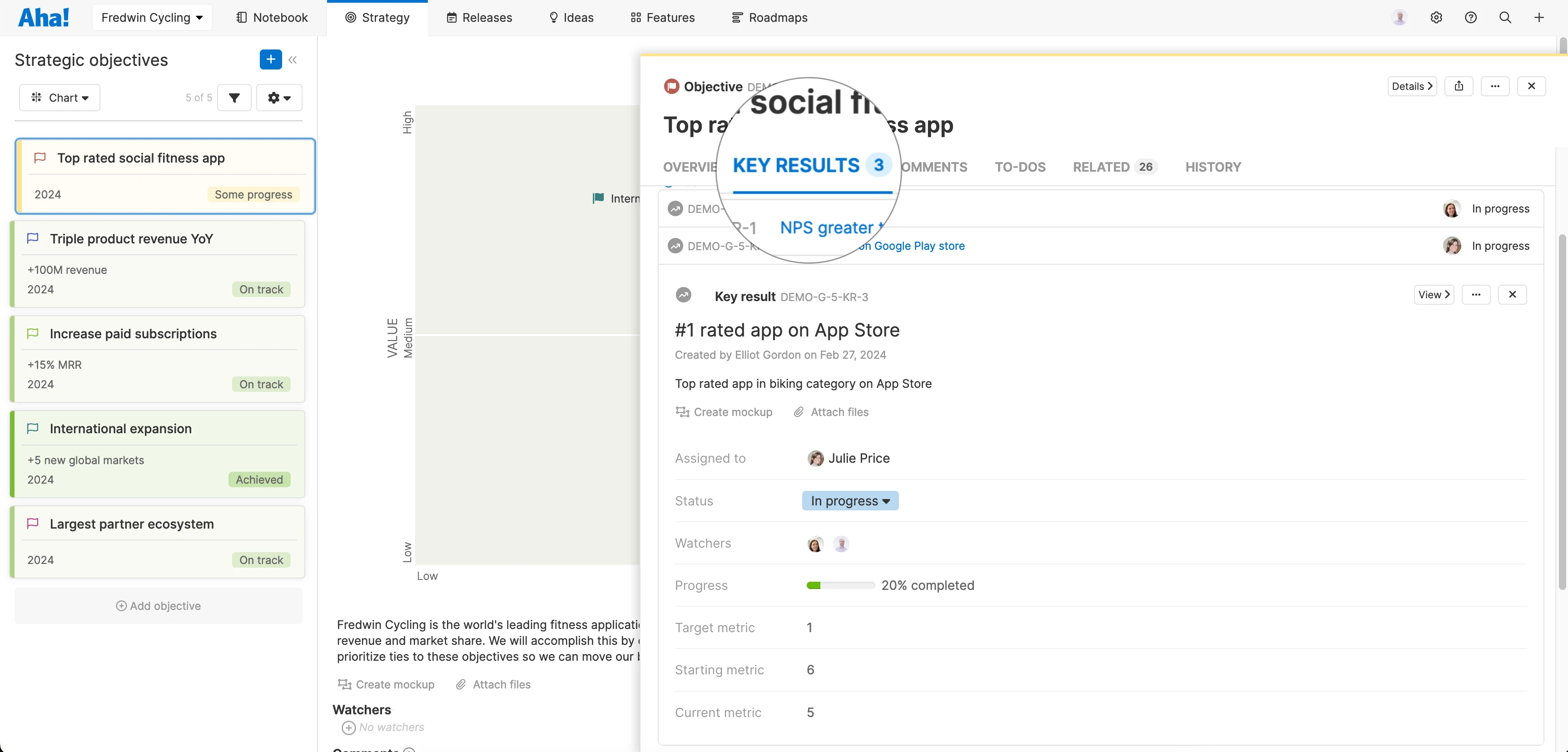 Objectives drawer with multiple key results in Aha! Roadmaps