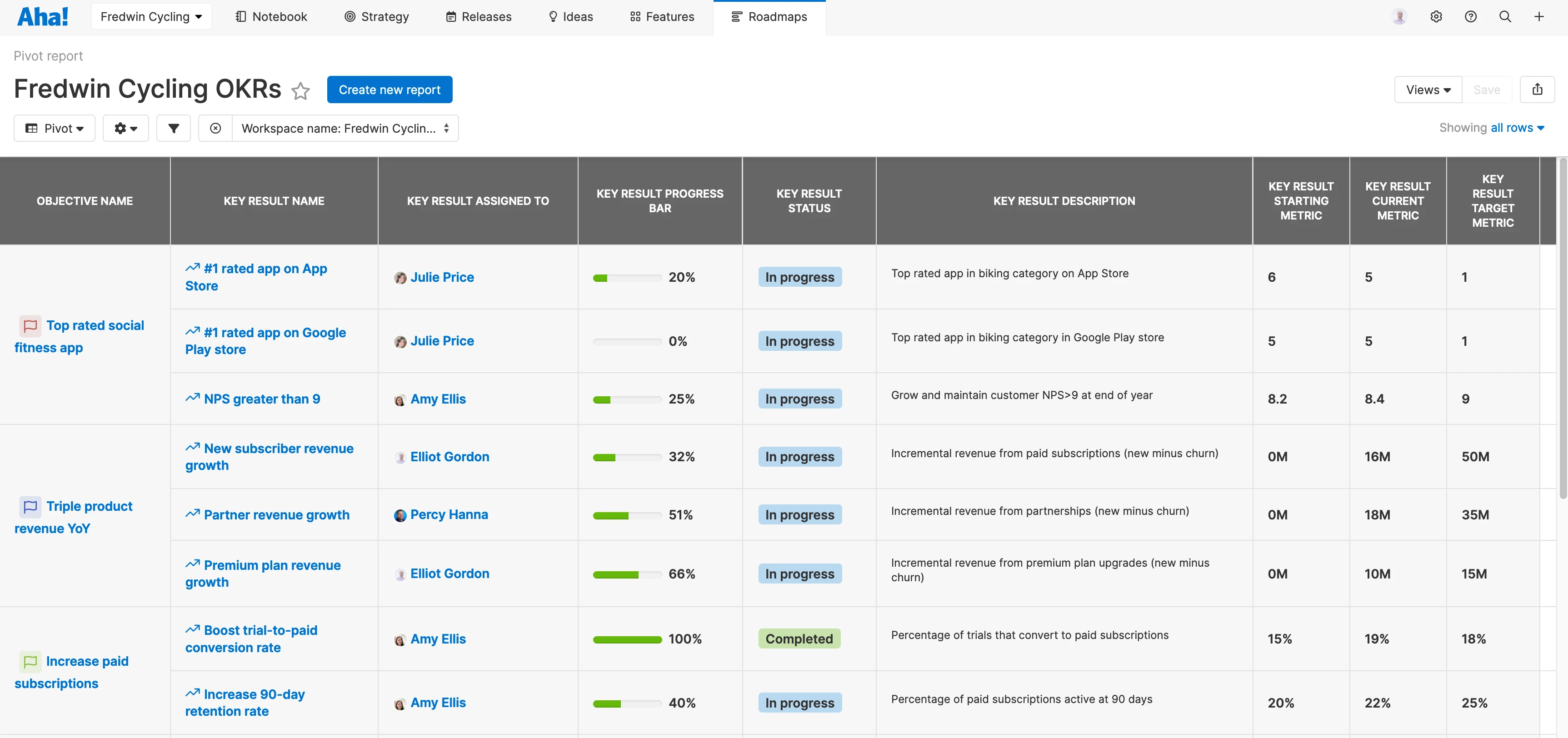 Now, let's consider what we should do once the first quarter is over. It is time to review Fredwin Cycling's OKR performance. Here, we have crafted a pivot report showing the status and progress of our key results nested inside their objectives. We can click any key result to see more details, including related work items. All of this information helps us see how we have performed and what we need to keep working on.