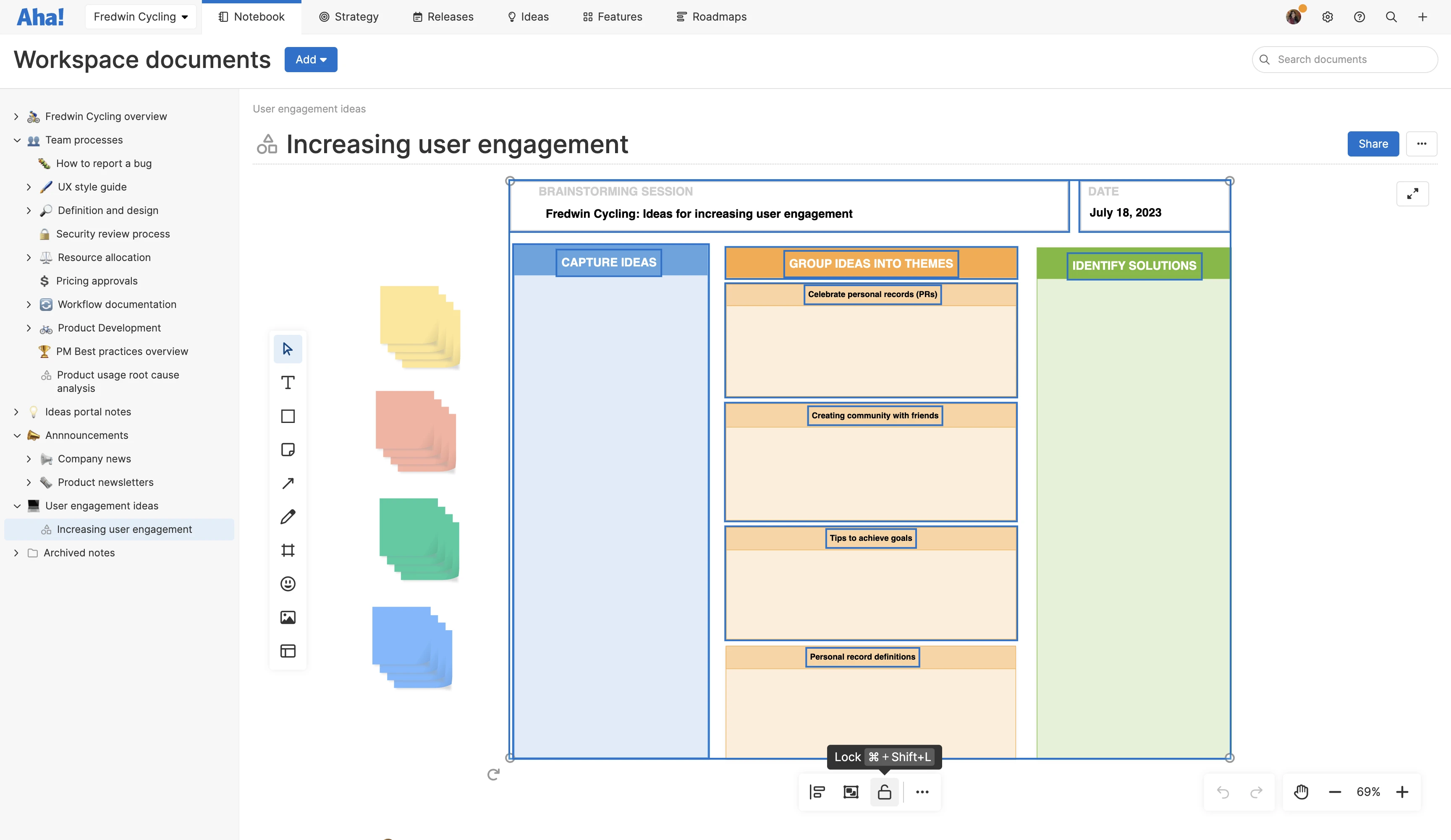 You can now lock whiteboard objects, add sticky notes with a single click, and show who created each sticky note — improving how you collaborate on whiteboards in Aha! software.