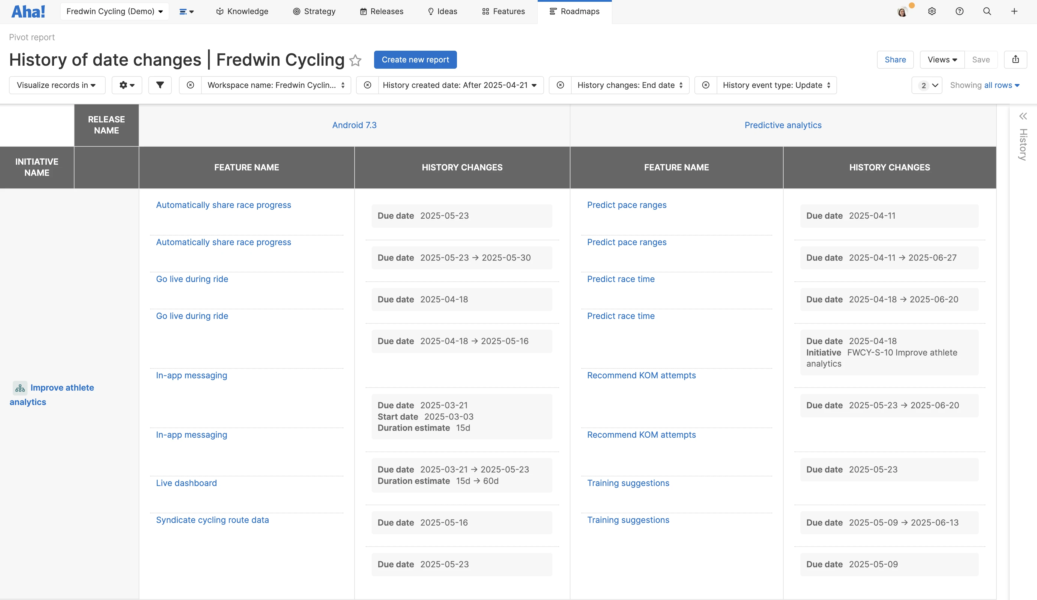 Create audit reports: Track how your plans evolve over time. Include history fields in reports to see what changed, when it changed, and who made the update. This is especially helpful for monitoring scope adjustments and delivery timelines (available in Aha! Roadmaps Enterprise+).