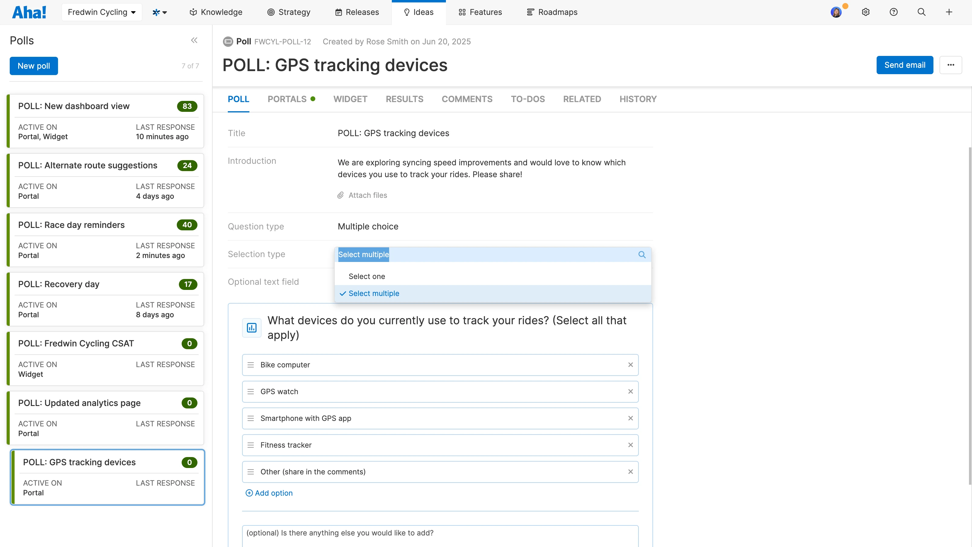 Launch multi-select polls: Let customers choose more than one option in a multiple choice poll. This new Aha! Ideas Advanced capability gives you a richer understanding of user needs and preferences.