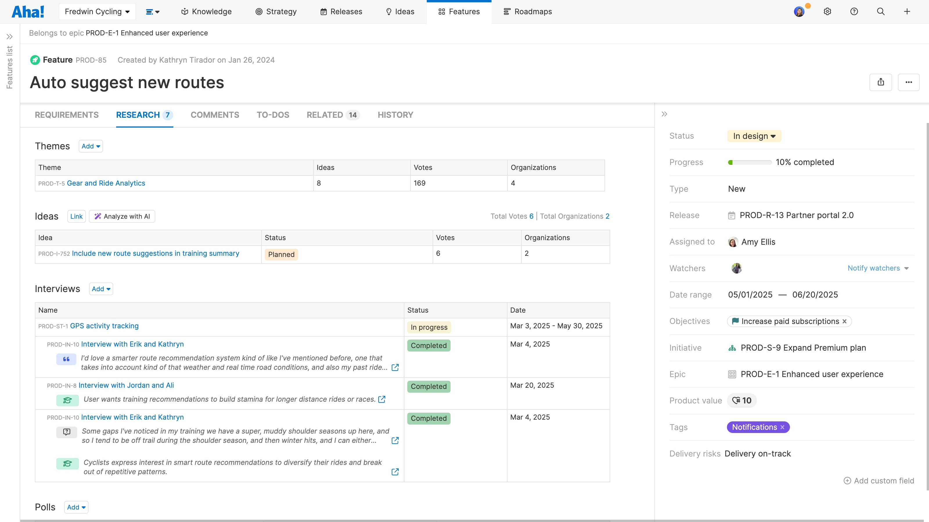 Validate your plans: Connect customer quotes and AI-generated learnings from interviews directly to work items in Aha! Roadmaps (e.g., initiatives, features, and ideas). This shows the customer evidence behind your product plans.