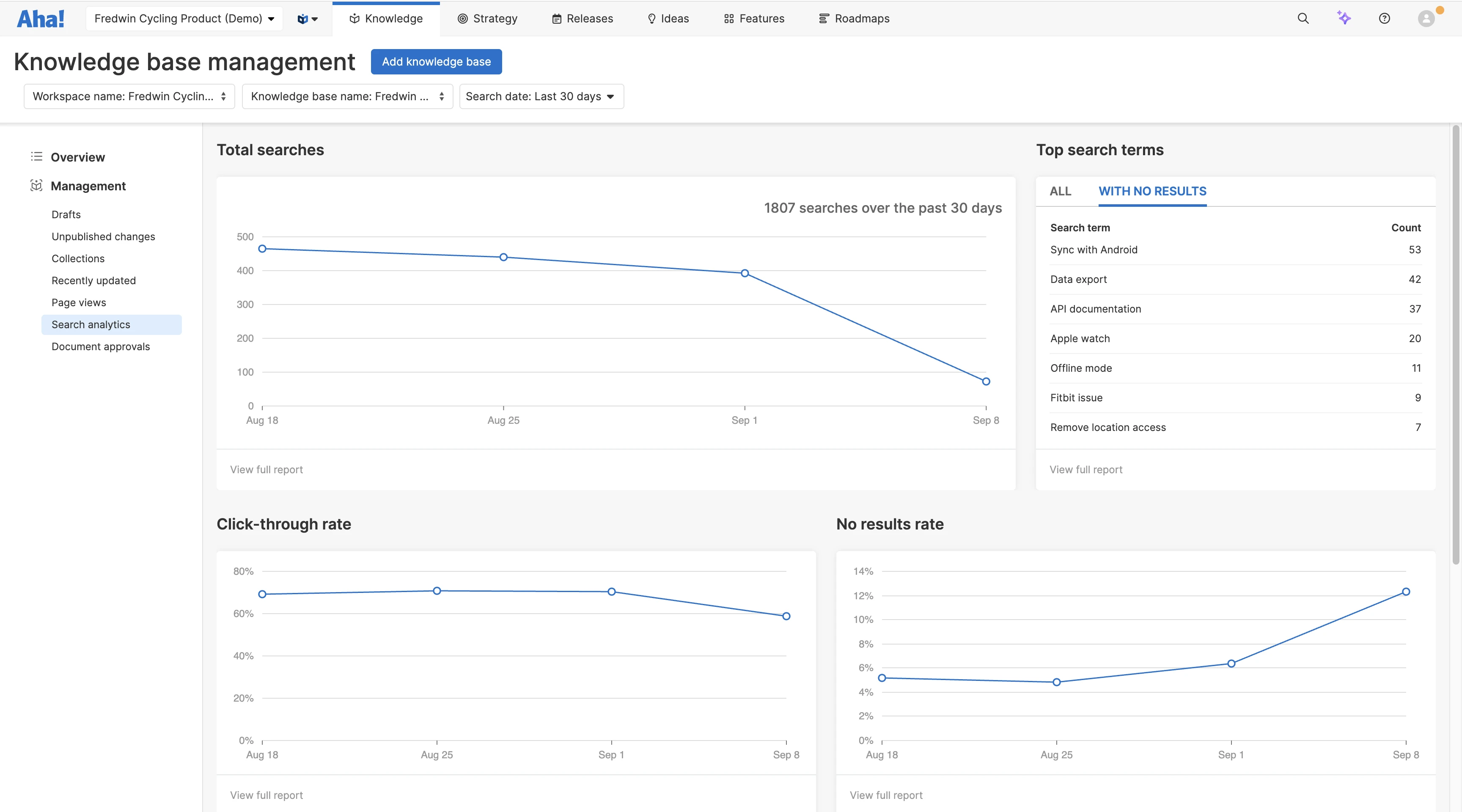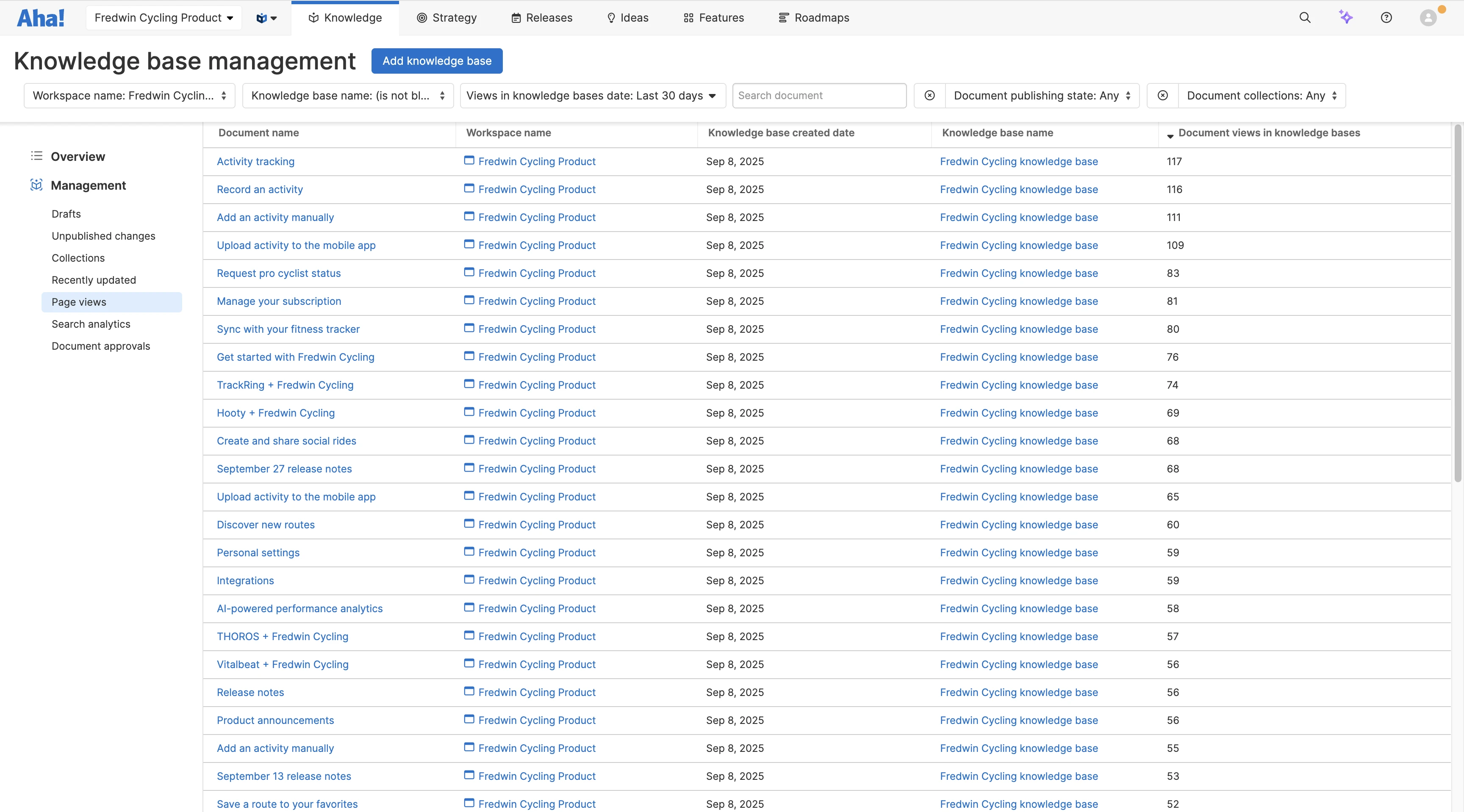 Use built-in knowledge base reports in Aha! Knowledge to understand what documentation people actually use and prioritize updates.