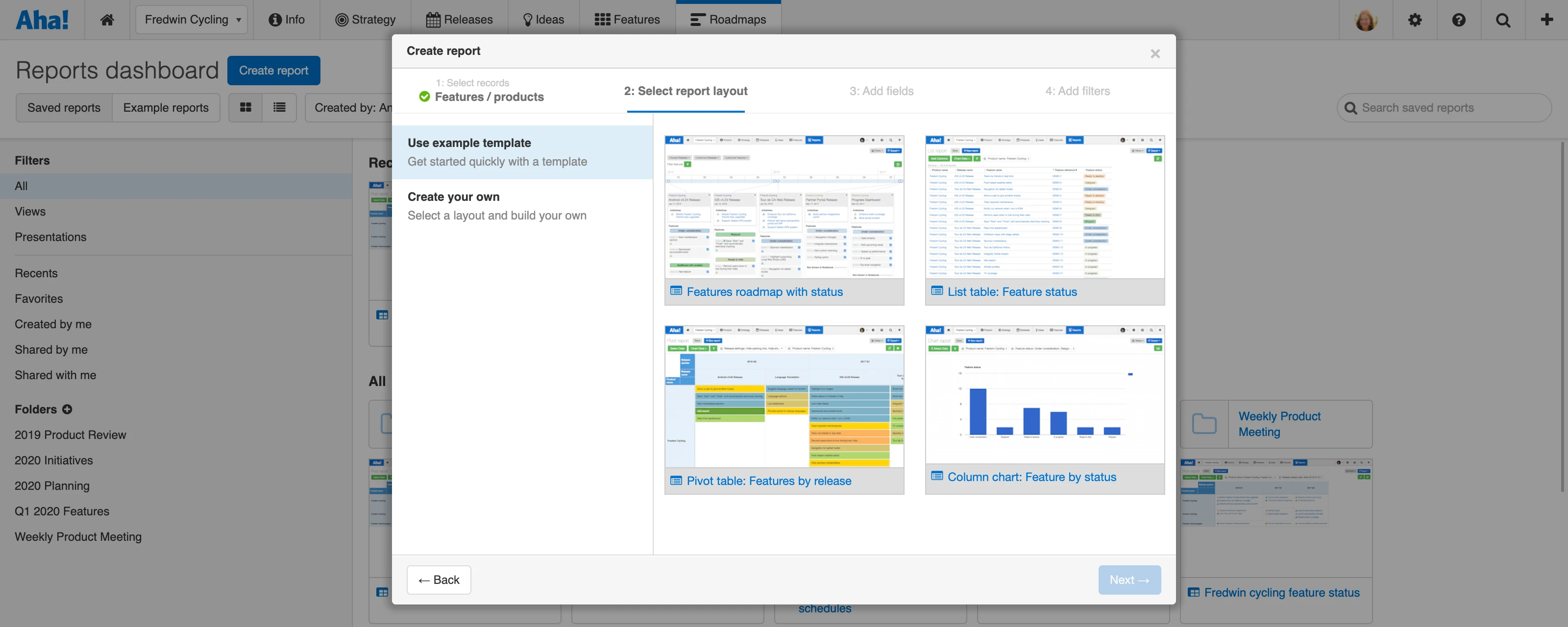 Start from an example report Aha! includes a library of more than 75 report templates. There are a lot to choose from! So we made it simple — the report builder automatically filters to only relevant templates. Once you select an example report, it will be created immediately (no further steps required). Now you can customize it to meet your needs.
