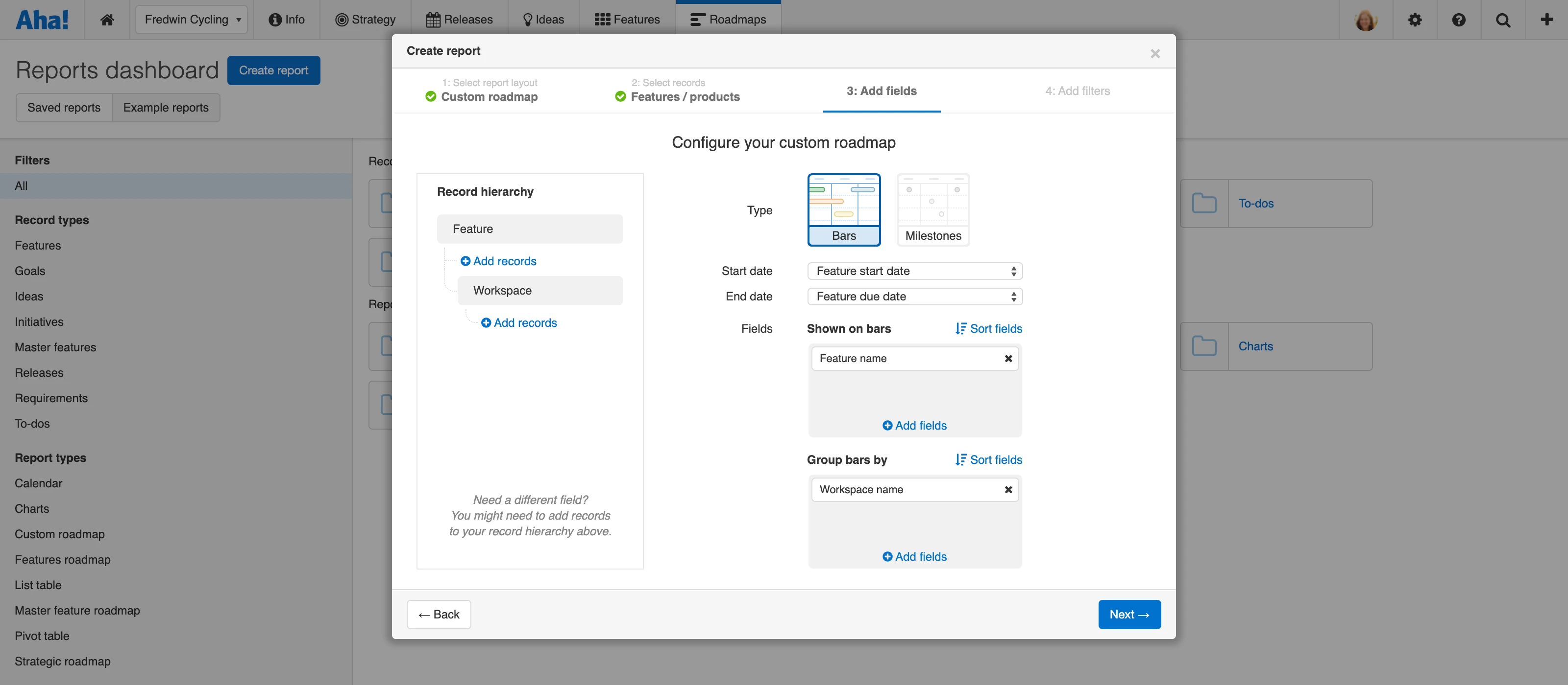 Create beautiful roadmaps too There are plenty of prebuilt roadmap types to choose from in Aha! — strategy, portfolio, and features to name a few. But sometimes you want to make your own. In the example below, you can see the options for a custom roadmap. Choose dates, add fields, and select how your roadmap bars should be grouped in one view.
