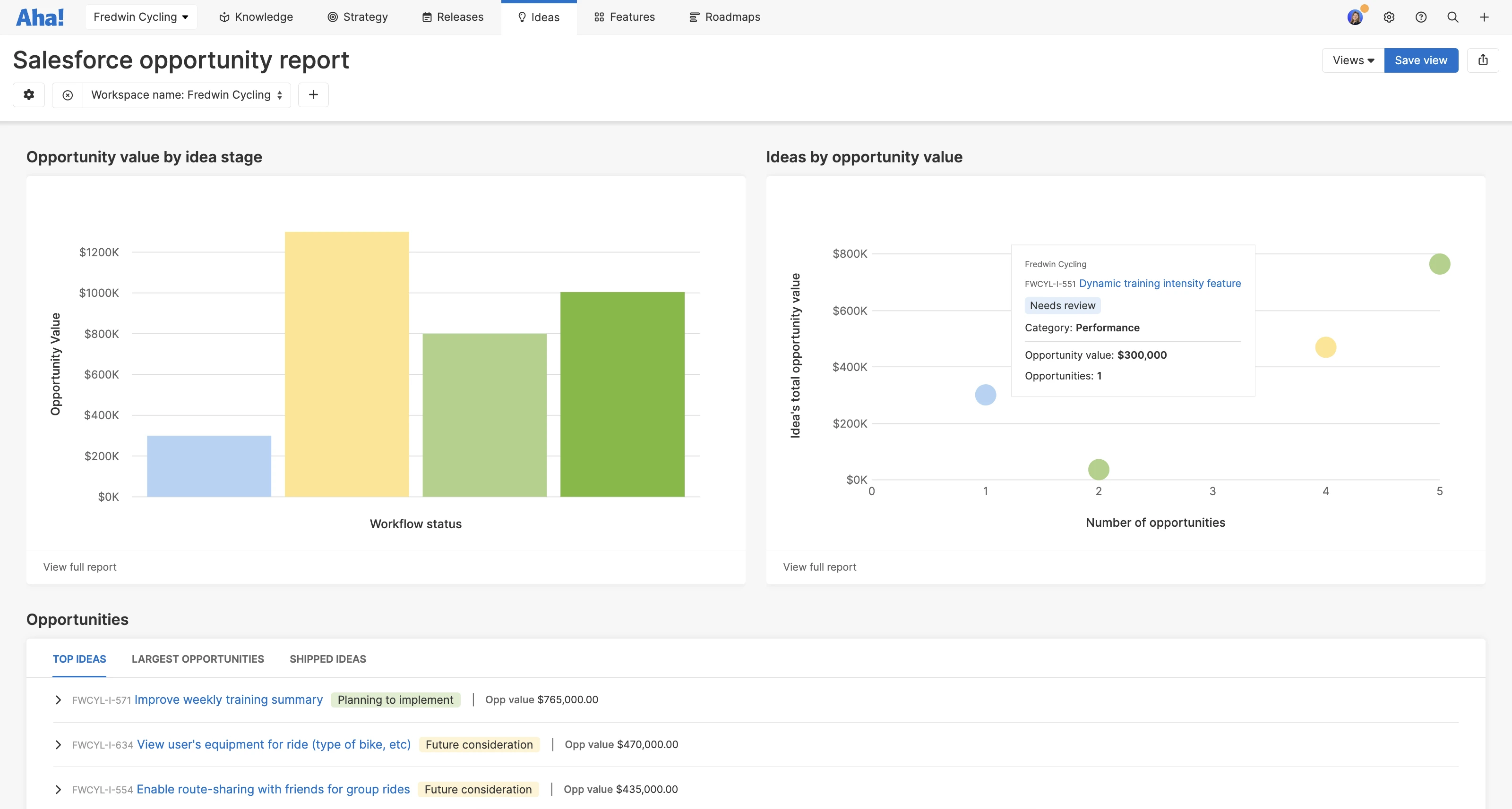 To start using this report, you must have the Salesforce integration installed with ideas linked to Salesforce opportunities. The Salesforce opportunity report is part of the Aha! Ideas Advanced plan.