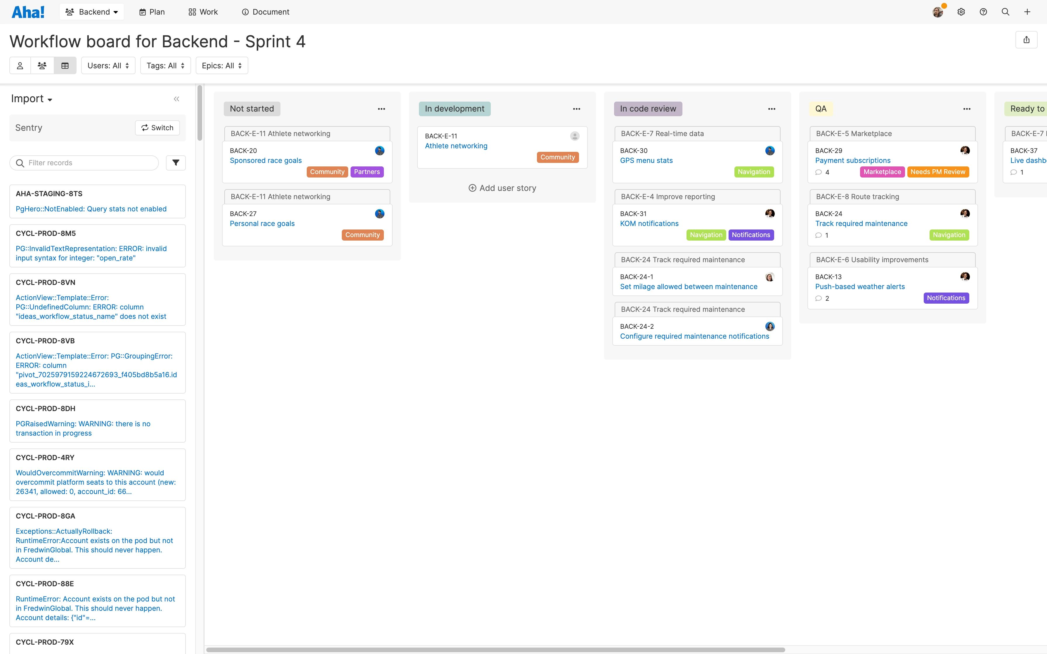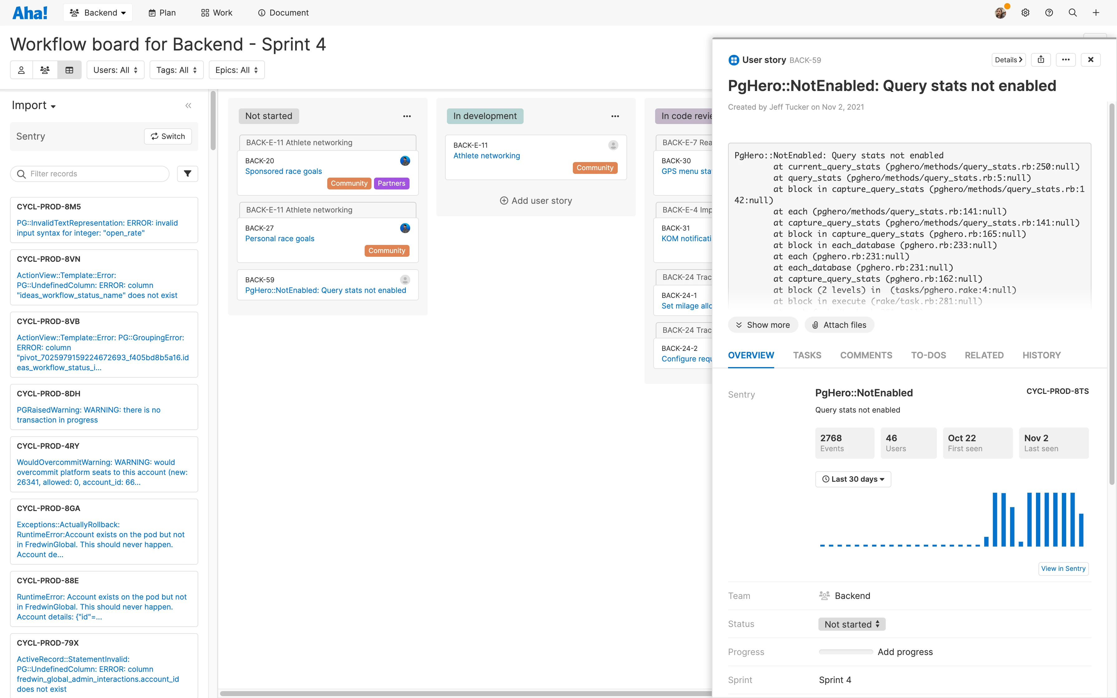 Install the Sentry extension and immediately start pulling open issues onto the workflow board in Aha! Develop or add them to an upcoming sprint. Each issue is added as a new feature (or user story) in Develop — with all the essential details from Sentry, such as the error name, message, and stack trace.